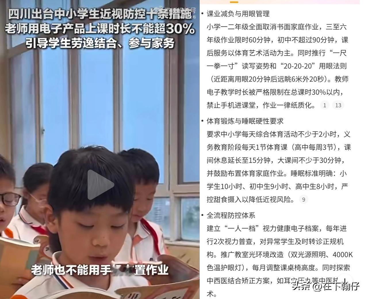 四川近日发布了中小学生近视防控十条措施,涵盖课业减负、睡眠保障、电子设备管控等刚性条款。 四川将学生视力健康纳入政府“健康四川”考核体系,对防控不力单位问责,这与国家《儿童青少年“五健”促进行动计划(2026—2030年)》目标一致——要求2030年小学生近视率降至32%以下。 取消低年级书面作业、严格控制课堂电子设备使用时长,直接减少了学生长时间、近距离用眼的负担。将视力健康纳入政府考核,并与国家防控目标挂钩,强调了睡眠保障和户外活动,这是近视防控中常常被忽略、却至关重要的自然疗法。 现在小孩子近视的越来越多,一个班上总有那么十几个眼镜,而且还有低龄化的趋势,我觉得就是电子产品耍多了,看电视,耍平板,刷手机,咋个不近视。孩子们近视,固然有学业压力因素,但课余时间被电视、平板、手机等电子产品大量占据,无疑是更普遍的现状。 理想的效果,需要学校切实减少电子依赖、保障户外活动时间,同时家庭也配合管理好孩子的课余屏幕使用,双管齐下,才能让孩子的眼睛真正“减负”。