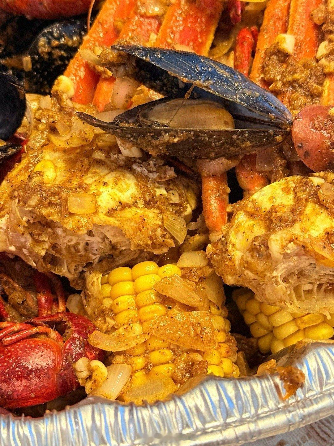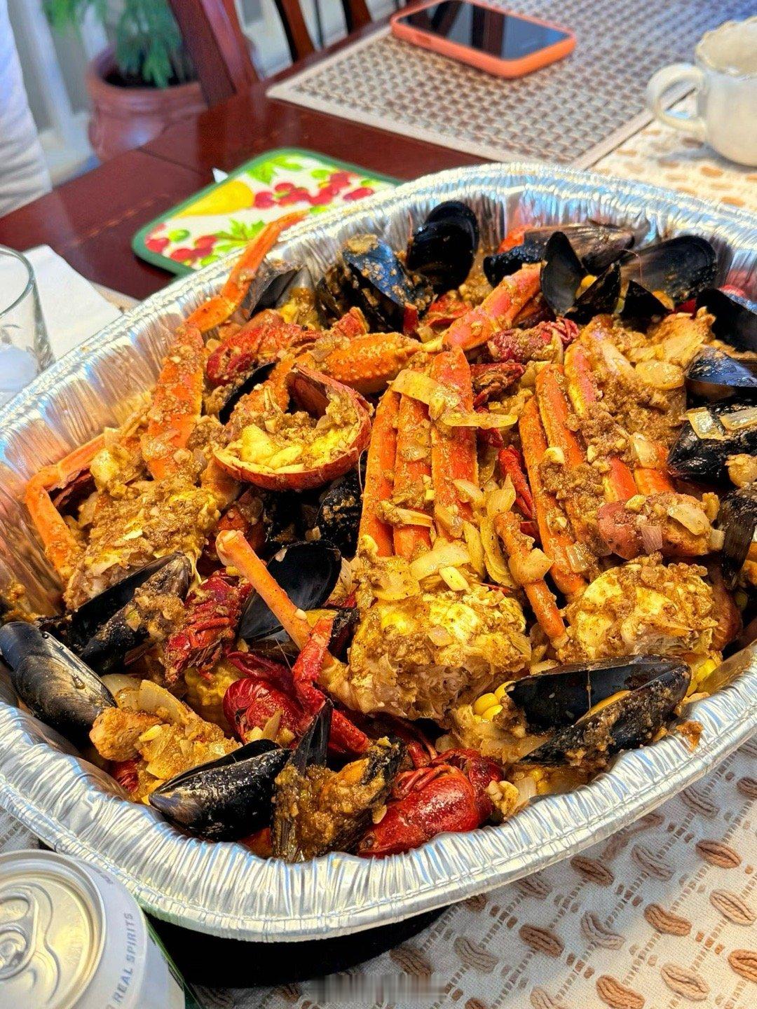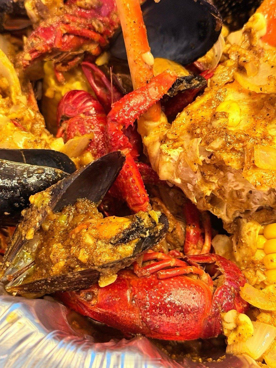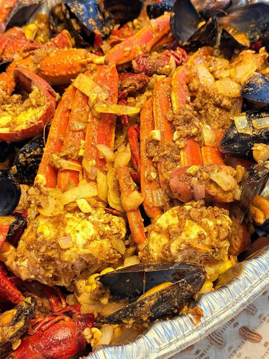 昨天乖妈又做Louisiana Cajun style海鲜招待客人,三人放开肚子吃还有剩。这一大盘在蟹屋吃得好几百。