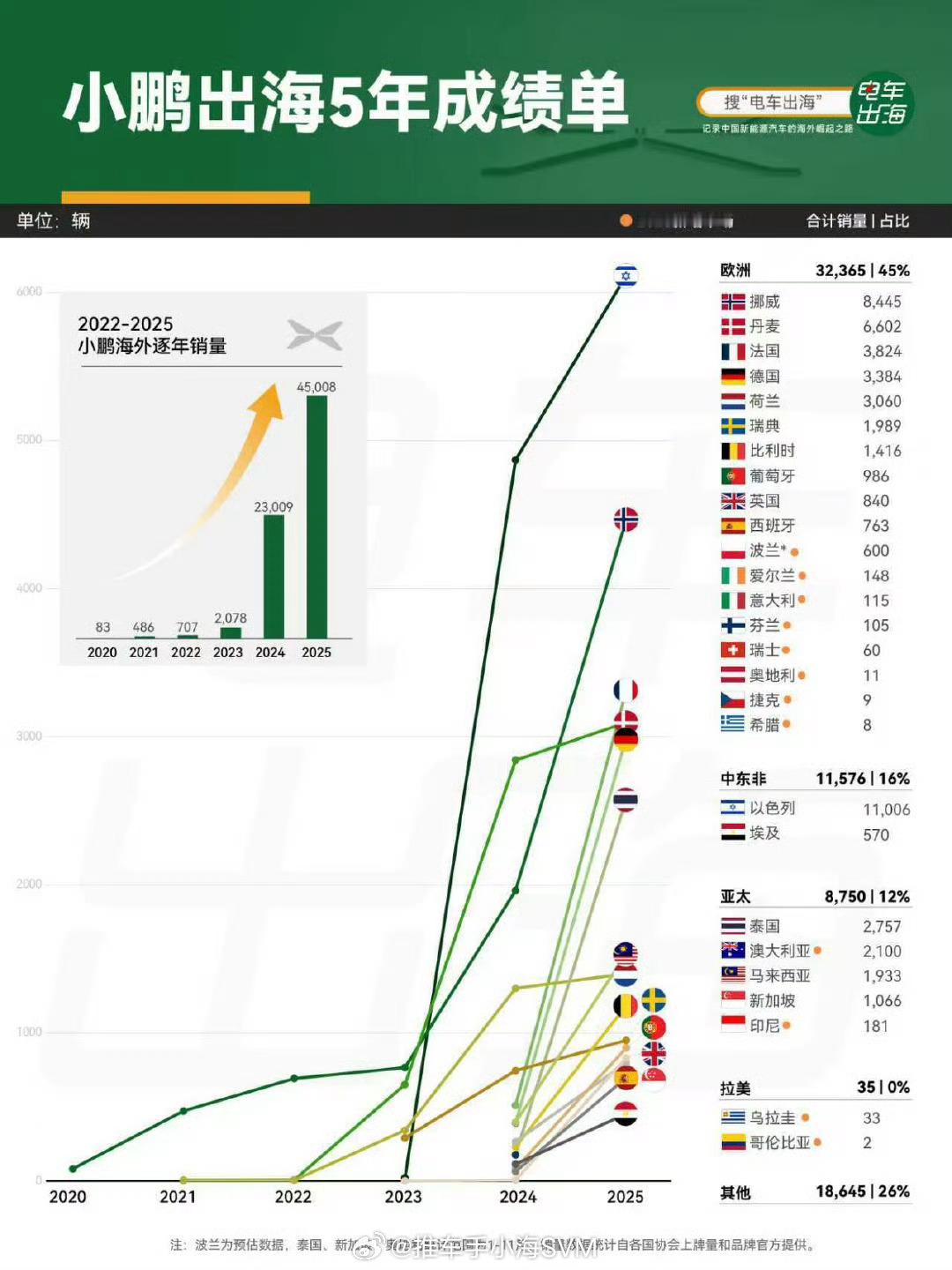 2025年,小鹏汽车不仅在国内表现很好,在出海方面,表现更好。全年海外交付45008辆,稳居新势力纯电第一,在所有自主品牌里还排到了第二,仅次于比亚迪。这4.5万辆出口车中,欧洲市场直接贡献了近一半销量。挪威、丹麦、法国这些国家都是小鹏的基本盘。亚太势头最猛,增速肉眼可见;而中东非市场虽然现在体量还不大,但以埃及为中心,也是不容忽视的新增长点。小鹏出海卖得最好的车,就是小鹏G6。主力车型G6销量同比增长超423%,成了绝对的爆款和口碑担当。而在亚太地区,X9作为纯电MPV,用连续数月登顶细分市场。现在的小鹏,已经不是“摸着石头过河”的阶段。它已经用欧洲市场的规模化证明了自己的产品力。现在小鹏已完成60个国家和地区的业务布局,海外门店超380家,小鹏充电网络覆盖31个国家和地区,接入充电桩超266万根,并在全球布局了9大研发中心。小鹏已经是一家不折不扣的国际品牌。汽场全开小鹏获新势力纯电出海第一2025海外纯电销量小鹏列自主品牌前二