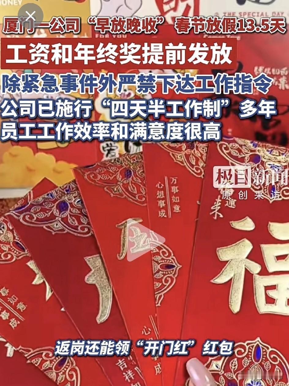 这公司是来拉仇恨的?春节放13.5天假,周三只上半天班,网友:这样的神仙公司,还招人吗? 最近,有家公司悄悄火了!不是因为产品牛,而是因为放假放得太“嚣张”! 前几天,厦门某科技公司的春节放假通知被员工“嘚瑟”上网,看完内容,网友集体破防: “腊月二十四就放假,放到正月初九,整整13.5天!” “每周只上4天半班,周三下午就能溜!” “放假期间老板不得找,这叫‘离线权’!” 更“气人”的是,这家公司还提前发年终奖、发年货、给交通补贴,返岗还有开门红包…… 有员工凡尔赛留言:“我们公司每年都这样,习惯了~” 公司回应:我们玩真的! 记者跑去核实,公司工作人员淡定表示: ✅放假长:是为了让员工避开春运,安心回家! ✅周三半日班:从2023年就开始实行了,“坐着干耗不如高效干活”! ✅离线权:放假就是放假,除非公司要倒闭了,否则别找员工! “员工满意度挺高的。”——这句话伤害性不大,“侮辱性”极强! 网友评论炸锅了: “请问贵司还缺扫地阿姨吗?我自带扫帚!” “我们公司:除夕当天放假,初七上班,佩服吧?” “周三只上半天班?我周三开会都要开到晚上8点……” ‘离线权’太需要了!我春节七天假,收了公司32条微信!” 都说“别人家的公司”香,这次是真见识了! 虽然咱们不能立刻让所有老板都学这操作,但至少看到了——公司对人好,员工效率高这事,真的存在! 建议各位老板悄悄学习,员工默默转发。万一呢? 梦想还是要有的,毕竟……这样的公司真的存在啊! 素材来源:极目新闻,侵联删!