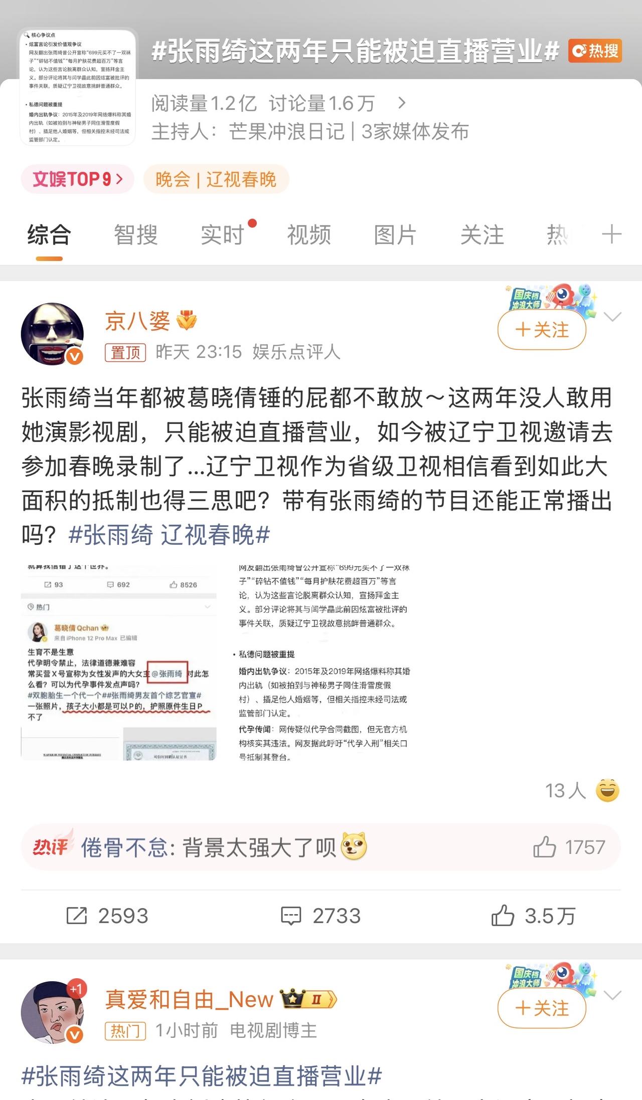哈哈哈哈哈哈,现在网友矛头从闫学晶转向张雨绮了! 他之前的699买一双袜子言论。 还有被葛女士锤的事情。 以及关于孩子的争议。 …… 统统被翻出来…… 真真假假不知道,但是争议真的很大! 看来辽宁卫视春晚节目外比节目本身更精彩啊! 评论区都整关闭了!现在辽宁春晚讨论度越来越高!好几亿了!太热闹了![捂脸][捂脸][捂脸]闫学晶