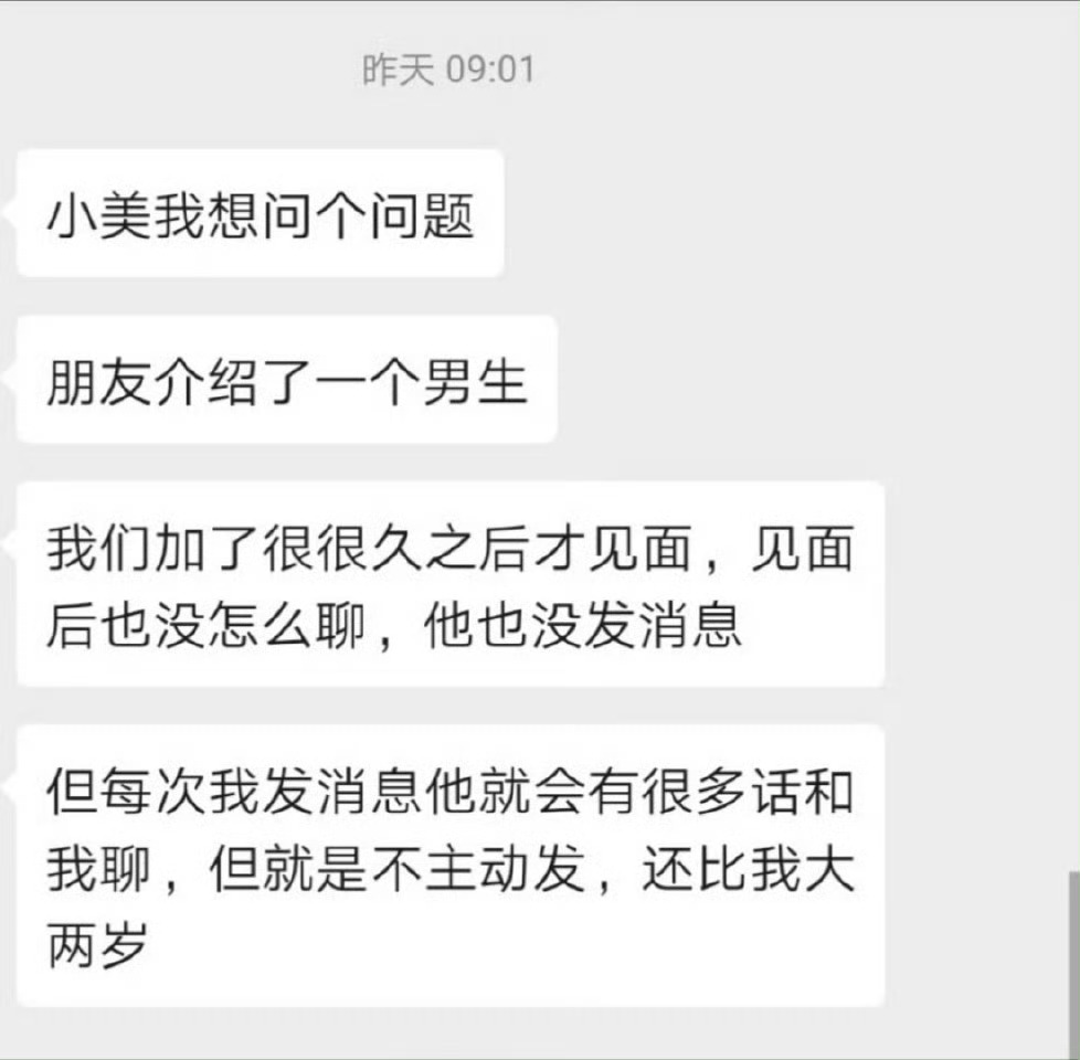 【我不找他,他就从不主动联系我】小美,朋友给介绍一相亲男生,我们加了很久之后才见面,见面后也没咋聊;他也没怎么主动给我发消息,但每次我找他就会有很多话和我聊;但他就是不主动,还比我大两岁呢!这是啥心态? 只要你谈过几次恋爱就会发现你会主动找对方聊天吗?马上又要过年了,屋头有催你么?我们穷人怎么就不能谈恋爱了 成都