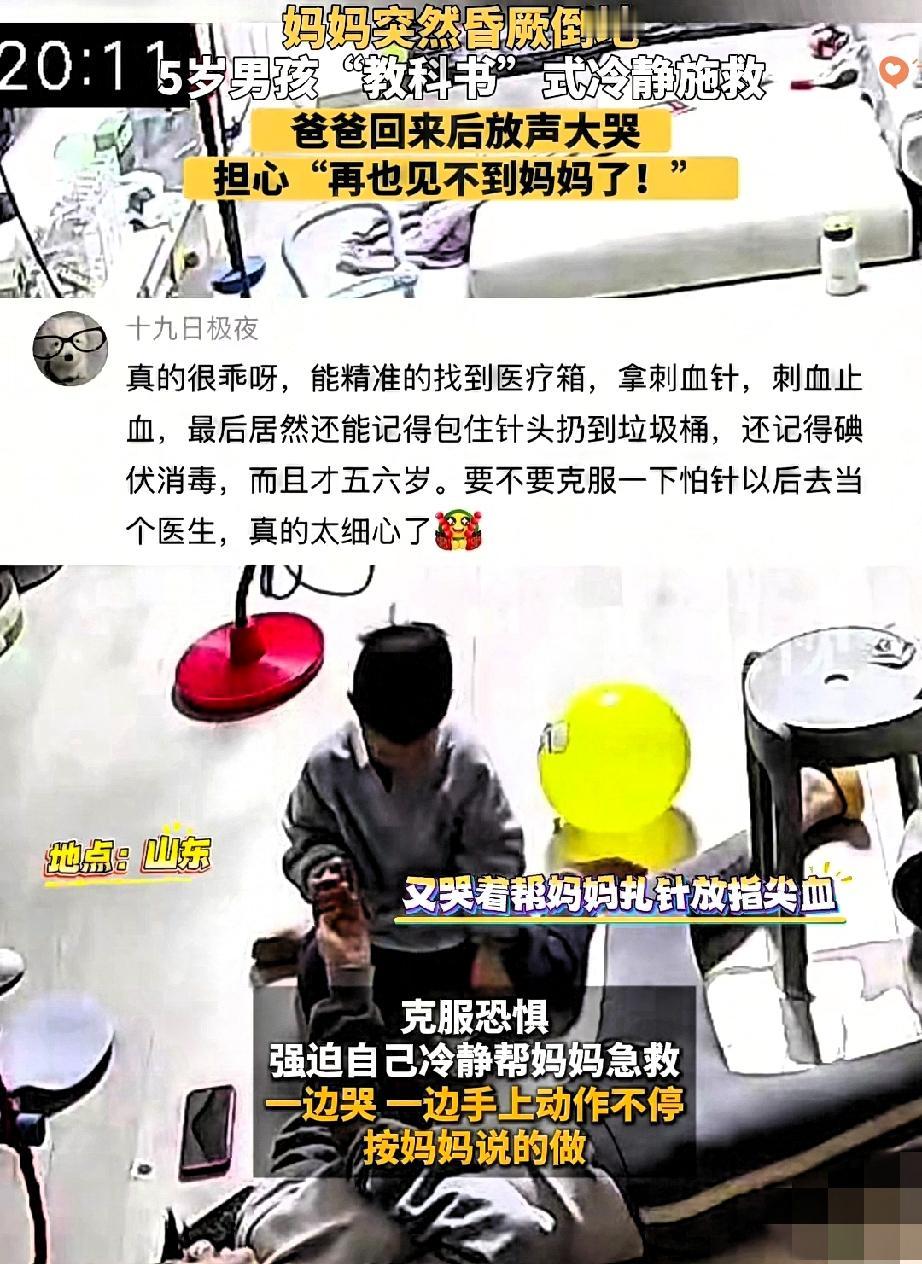 谁能想到,5岁娃竟成了妈妈的“救命恩人”!山东这位宝妈的经历,看完直接破防。 宝妈在家加水时突然昏厥倒地,5岁儿子听到动静冲过来,没哭没闹,照着妈妈的微弱指挥,一边掉眼泪一边掐人中、找针盒放指尖血,还不忘用碘伏消毒。 小小的身影蹲在地上,手都在抖却动作没乱,直到爸爸回家才崩溃大哭。 这哪里是孩子,分明是小英雄啊! 很多人觉得安全教育是“大人才需要的事”,却忘了孩子的潜力远超想象。 这位妈妈平时的言传身教,关键时刻竟成了救命稻草。 不是每个孩子都能在恐惧中保持冷静,但每一次看似不起眼的安全教育,都可能在未来某个瞬间撑起生命的希望。 你家娃几岁开始接触安全知识? 平时会教哪些急救小技巧? 评论区聊聊~
