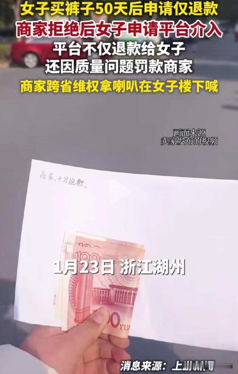 平台的仅退款规则,这一次把商家折腾的不轻。 起因是湖州的一名女子购买了裤子,50天以后申请仅退款,平台支持了消费者的诉求,并对商家进行了处罚。 但是商家却崩溃了,才有了商家跨省维权,在女消费者的楼下用喇叭呼喊的画面。 从这个事例中也可以看出,平台对消费者负责没有问题,但也要有个度啊,不能一味欺负商家,如果要是被某些不良的人利用规则一味的薅羊毛,这是对整个信任体系的打击。