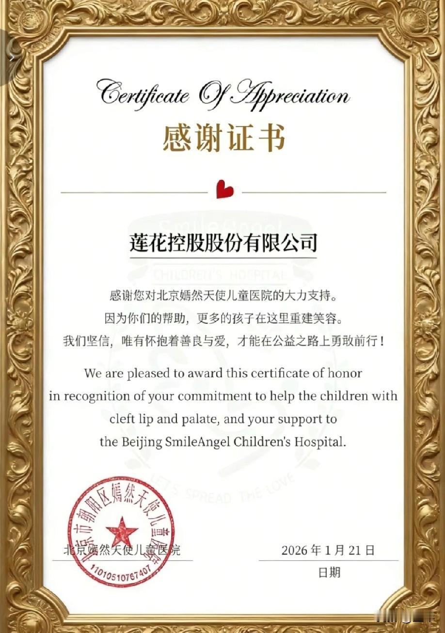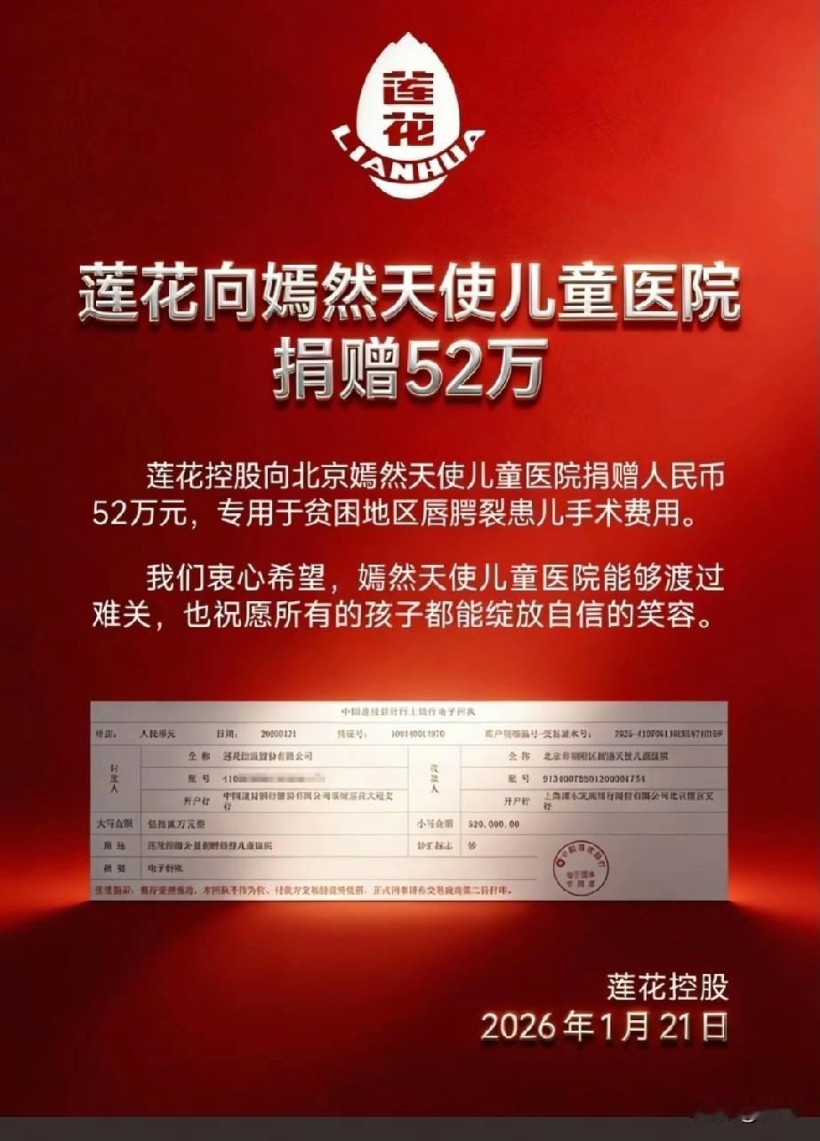今天要说一说我们的国货之光莲花控股集团,捐52万救嫣然天使儿童医院,这才是民族企业的担当。 在当下这个充满不确定性的时代,我们总在寻找一些能让人心头一暖的力量。 1月21日,一则来自莲花控股的消息,让无数人破防了。这家我们从小吃到大的国货品牌,在自身正处于转型升级的关键期,却毅然拿出52万元,定向捐赠给北京嫣然天使儿童医院,专项用于贫困地区唇腭裂患儿的手术费用。 不是作秀,是刻在骨子里的善良 有人说,企业做公益是为了博眼球。但莲花控股的这份善意,却让人无法质疑。 捐赠的时间点,正是嫣然天使儿童医院因资金短缺、面临停摆的危急时刻。这笔钱,不是锦上添花的宣传费,而是实打实的“救命钱”。从转账凭证到医院颁发的感谢证书,每一个细节都在诉说着:这不是一场营销,而是一次发自内心的驰援。 国货的底气,从来不是流量,是良心 我们总在说“支持国货”,但真正的支持,从来不是一句口号。 当鸿星尔克在河南暴雨中倾囊相助,当莲花控股在嫣然医院最困难时伸出援手,这些民族企业用行动告诉我们:所谓国货之光,不仅是品质的保障,更是危难时刻的挺身而出。它们或许没有国际大牌的光鲜,却有着最朴素的家国情怀——自己淋过雨,所以总想为别人撑把伞。 你的每一份消费,都是在为善良投票 很多人说,现在的市场太浮躁,好产品总会被淹没。但莲花控股的故事告诉我们:真正有温度的品牌,永远不会被辜负。 当我们选择一包莲花味精,其实也是在为这份“取之于民、用之于民”的企业良心投票。在这个流量至上的时代,莲花控股用52万元告诉我们:商业的终极目标,从来不是冰冷的利润,而是温暖人心的善意。 愿更多国货能像莲花一样,在追求发展的同时,守住那份最本真的社会责任。也愿我们每一个普通人,都能在消费的选择中,为这些有担当的品牌多一份偏爱。毕竟,只有让善良的企业走得更远,我们的社会才会充满更多光亮。 冬日生活打卡季莲花味精