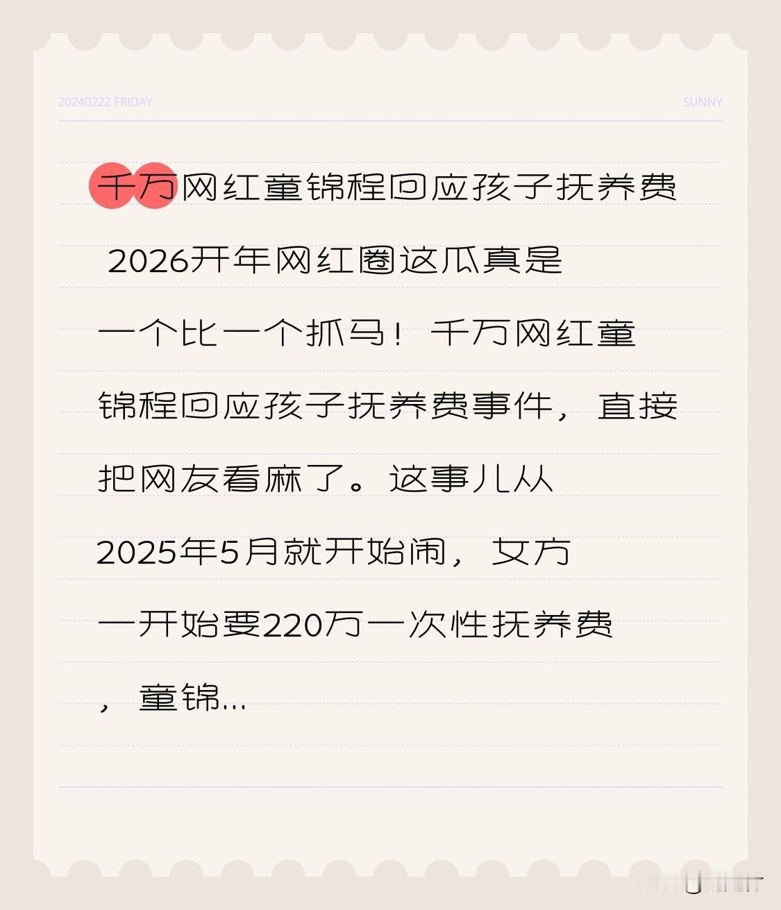 千万网红童锦程回应孩子抚养费 千万网红童锦程回应孩子抚养费 2026开年,网红圈的瓜一个比一个抓马!千万网红童锦程回应孩子抚养费事件,直接把网友看呆了。 这事儿从2025年5月起开始闹。女方一开始要求220万一次性抚养费,童锦程只肯每月给3000元。女方产后加码,双方互撕近8个月。 童锦程直播喊冤,称只认法院判的每月3000 - 5000元抚养费,多一分都不给,还指责女方骗孕。可女方直接打脸,孩子出生60多天连出生证明都没有,就因他不配合亲子鉴定。而且女方承担了所有费用,他连一件婴儿用品都没买,还在女方孕期骂胎儿,一边扯抚养费一边官宣新恋情。他年入数千万,一条广告就40万,却只愿掏这点抚养费,真不知他咋想的。