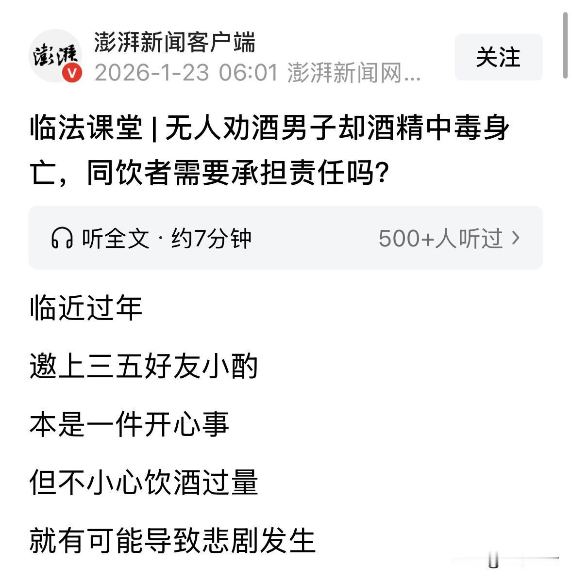 广西桂林,男子和好友聚餐喝酒,喝完一轮,他又被另一朋友叫走,转场去了第二轮,期间没人劝酒,男子却因为自己饮酒过量,酒精中毒死亡了。男子妻儿认为,酒桌上同饮的7人一个也跑不了,他们诉至法院,索赔56万,法院判决让妻儿和同饮者都傻了眼。 2025年2月15号下午,刘某被宁某和王某喊到王某家喝酒。 三个人用一次性塑料杯,喝了大概三杯20多度的米酒。 这点酒量对常人来说可能不算啥,但对刘某来说,这只是个开始。 喝完第一场,宁某和王某把刘某送回了家。按理说,回家就该歇着了。 可没过多久,另一个朋友曾某又找上门,拉着刘某去廖某家接着喝。 宁某和王某虽然也跟着去了,但只在廖某家待了几分钟就走了,没多逗留。 这时候的廖某家,已经有廖某、杨某、杨某某、曾某、聂某等5个人在聚餐。 刘某进门后,情绪有点不对劲,嘴里骂骂咧咧,还到处发烟。廖某因为跟刘某以前有过节,不想跟他同桌,就和另外两人先后离席了。 这一走,桌上就剩下曾某、杨某、杨某某、聂某和刘某。 刘某没人管了,开始自顾自地猛灌米酒。这酒喝着喝着,刘某的意识开始模糊,人彻底醉过去了。 傍晚6点左右,廖某听说刘某喝得烂醉,怕出事,就喊来了刘某的儿子刘文某和他的同学,一起把不省人事的刘某抬回了家,交给儿子照顾。 晚上7点,刘某老婆下班回来,8点多发现老公情况不对,赶紧打120。 但医生赶到时,人已经没了。 尸检报告出来,显示刘某血液里乙醇含量高达444.8mg/ml。 要知道,这已经超了严重醉驾标准,也就是80mg/ml的五倍多! 鉴定结论很明确,刘某属于乙醇中毒死亡。而且警方查了刘某的微信,发现这人平时就是个酒懵子,经常喝得醉醺醺的。 人没了,刘家的老婆孩子肯定接受不了。他们觉得,虽然刘某自己爱喝酒,但如果不是廖某、曾某这帮人跟他一起喝,尤其是曾某硬拉着他去第二场,人也不会死。 于是,他们一纸诉状把当时在场的7个人全告上了法庭,索赔56万多。 在刘家人看来,我家老公是跟你们喝酒喝死的,你们每个人都得赔钱! 但法官审理认为,喝酒本身是情分,不喝酒是本分。但一旦坐上桌,大家就有了照应的义务。 谁没照应好,谁就得担责。 先说宁某和王某。虽然是第一场酒局的组织者,但他们把刘某送回家了,后面去廖某家也没劝酒,尽到了责任,判——无责。 再说廖某、杨某、杨某某、聂某。 这几个人虽然在第二场,但都是各喝各的,没人逼刘某喝,也没人故意整他。 特别是廖某,虽然跟刘某有矛盾,但最后还是喊人把刘某送回了家。 法官认为,廖某不仅没过错,反而做了该做的事,所以他无责。 最后只剩下曾某。为什么是他?因为是他把刘某从家里喊出来去第二场的。 作为邀约人,曾某明知刘某第一场已经喝了酒,却没提醒他少喝点。 更关键的是,当刘某在酒桌上喝得人事不省时,曾某作为同桌的人,没把他安全送回家,也没送医,只是看着他醉倒。这就是没尽到照顾义务。 法院最后敲定:曾某承担5%的责任,赔点钱了事。其他人全免责。 刘某家属一听那是万般不乐意,才5%?一条人命就值这点钱? 他们不服,上诉到二审法院。 《民法典》第1165条规定:行为人因过错侵害他人民事权益造成损害的,应当承担侵权责任……被侵权人对损害的发生也有过错的,可以减轻侵权人的责任。 共同饮酒属情谊行为,但衍生出法定的安全保障义务。 二审法官依然认为,曾某作为邀约人,明知刘某已饮酒却未提醒节制,且在刘某醉酒后未及时送医或妥善照料,存在疏忽大意的主观过错,所以需承担5%的次要赔偿责任。 刘某作为完全民事行为能力人,连续豪饮导致酒精中毒,对损害后果负主要过错。依据过失相抵规则,应大幅减轻其他同饮者的责任。 宁某、王某、廖某等人已尽到合理限度内的照顾义务,无主观过错,故不担责。 所以,二审维持了原判。 为什么判这么轻?法官说了大实话:刘某是个成年人,自己啥酒量心里没数吗?连喝两场,血液酒精浓度飙到444,这纯粹是自己作死。 他自己得负主要责任,甚至可以说是95%的责任。曾某虽然有点过错,但也就是个次要中的次要。 有人说,一个成年人,要对自己的行为负责,自己的健康,只有自己最清楚,酒桌上没人劝酒,自己喝死了,别人还要承担百分之五的赔偿,法院判决站不住脚,属于乱判,必须上诉。 我们参加婚宴都是自己斟酒,别人是不会给你到酒,虽然说有共同举杯的言语只是祝福,举茶举饮料不限。自己斟酒自己喝,与别人无关! 对于这件事,你怎么看? 欢迎关注@一案一论