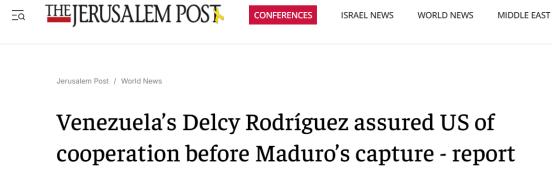 外媒报道惊人内幕!2026年1月23日报道:马杜罗被捕前,副总统和她的兄弟们暗通美国。 2026年的开年,美国的一举动就引起了国际的高度关注。美国对委内瑞拉发动军事行动,委内瑞拉总统及其夫人被美国强行绑走。在事件发生后,多个国家强烈谴责美国的举动,委内瑞拉也第一时间对此事表态。 作为一国总统被逮捕之后,委内瑞拉副总统德尔西·罗德里格斯则成为了代总统。在其就职之后,2026年1月10日时发表讲话,明确表示要解救被美国强行控制的总统马杜罗及其夫人。 她的这番发言获得了很多人的认可,在国内的支持力也有明显提升。可就在这个关键时刻,外媒的一篇报道却让她陷入了质疑声中。 2026年1月23日的时候,据外媒报道在马杜罗被捕之前,她和他的兄弟们就暗通美国!向美国做出保证,一旦将马杜罗拉下台,就会与美国合作。此事带来争议非常大,立即成为国际讨论焦点! 其实在马杜罗被抓走之后,相关猜测就已经出现。当时就有不少声音认为,美国能够顺利抓捕马杜罗,一定是有内应存在。 据悉,在马杜罗夫妇被美军强行控制之后。委内瑞拉临时政府内部就流传出来了一句话:“我们不是败给了美国,而是败给了身边的内鬼。” 所以将这两起事件联合到一起去看,很难不让人猜测,德尔西·罗德里格斯同美国达成了某种共识,联合美国将马杜罗拉下台!这件事情的发生也再一次提醒着我国,国家的安全虽受外敌影响,但更多的是受内部影响。 对此,您怎么看? (信息来源:Venezuela’s Delcy Rodríguez assured US of cooperation before Maduro’s capture - report-The Jerusalem Post)