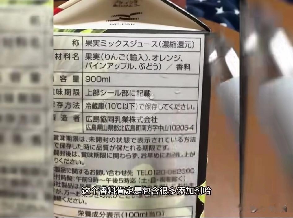 “日本饮料没有添加剂”的滤镜也该摘下来了, 有位在日本的博主,特意从超市买来了包括咖啡,牛奶,果汁,茶等众多的饮料,并且一一看了配料表,几乎每一款饮料都有香料,甜味剂等添加剂,而且还在果汁配料表里面还出现了尿素。 有网友就说,在国外对于添加剂的要求并不是那么严格,因此只用香料等概括性的词汇就可以全部代替,而不是像我们这样,要把所有的原素都要单列出来,这才让那些“吹日”分子感觉特别干净。 看看那些“吹美”“吹日”分子以后又少了一个创作的领域。