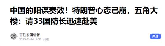 中国的阳谋奏效!特朗普心态已崩,五角大楼:请33国防长迅速赴美   先聊聊特朗普 1 月 16 日在社交平台官宣的 “和平委员会”。这老头野心大得很,一开始说要管加沙战后治理,转头就放话 “早晚替代联合国安理会”,还拉上女婿库什纳、国务卿鲁比奥这些亲信当骨干,甚至搞出个 “10 亿美元买永久席位” 的规矩,合着国际话语权是菜市场买菜呢?   他满世界发邀请,本以为各国得抢着来,结果等到签字那天傻了眼:受邀的几十个国家里,只有 19 个签了字,还全是巴林、摩洛哥这种没多少分量的小国,五常一个没来,连欧洲盟友都集体装死。   更有意思的是中国的态度。面对美国的邀请,外交部就两句话:“收到了”“没别的信息”。不骂也不加入,就冷眼看着特朗普自己折腾。这正是中国的 “阳谋”。   咱早就摸透了特朗普的性子,劝是劝不动的,得让他自己撞南墙。果然,这 “特朗普版联合国” 刚搭台就塌了,成了全球笑柄。有欧洲外交官私下吐槽:“这哪是和平委员会,分明是霸权俱乐部。”   这边 “和平委员会” 刚翻车,特朗普惦记的格陵兰岛又出了岔子。这地方是世界最大岛,藏着稀土、石墨这些芯片制造的刚需矿,还扼守着北极航道,战略价值堪比 “北极钥匙”。   特朗普早在第一任期就想收购,没成;2025 年重返白宫后更嚣张,1 月 20 日直接晒出自己扛着美国国旗登岛的照片,身后牌子写着 “2026 年成为美国领土”,甚至放话 “不排除动武”。   可他打错了算盘。丹麦首相直接硬刚:“主权没得谈,贸易战奉陪到底”,转头就往格陵兰岛派了 1000 名士兵,首府努克和南斯特伦菲尤尔都驻了兵。欧盟更狠,委员会主席冯德莱恩在达沃斯直言 “主权不能买卖”,欧洲议会当天就冻结了和美国的贸易协议审批。   连加拿大都站出来反对,总理卡尼刚访华签完电动车大单,底气十足地说:“中等国家不上桌,就会上菜单!” 意思很明白:咱宁愿跟中国合作,也不受美国拿捏。   这两下重击直接把特朗普的心态搞崩了。1 月 20 日白宫记者会上,他本来要炫耀 “上任一周年 31 页成就清单”,结果说着说着就把清单往地上一摔,砰的一声吓懵全场。   之后 24 小时里,他在社交平台发了 80 多条帖子,一会儿骂欧洲忘恩负义,一会儿扯童年棒球梦,连 “上帝该为我骄傲” 这种话都冒出来了,活像个输急了的孩子。   更离谱的是,他还致信挪威首相撒气,说 “不给我诺贝尔和平奖,我就不跟你讲和平”,可谁都知道,和平奖是挪威诺贝尔委员会评的,跟政府八竿子打不着。   就在特朗普乱发脾气的时候,五角大楼急了。军方高层心里门儿清:外交路走不通,只能靠军事手段挽尊。这次召集 33 国防长开会,名义上是 “西半球安全合作”,实则是想把各国绑上美国战车。   毕竟格陵兰岛在西半球,中国又刚推动《公海生物多样性协定》秘书处落地厦门,在海洋治理上抢了话语权,美国急着要巩固 “后院”。   可这招未必管用。要知道,特朗普上台后把西半球盟友得罪了个遍:跟墨西哥打贸易战,骂巴西 “办事不力”,逼加拿大站队反华。现在突然喊大家开会讲 “共同价值观”,谁信啊?   巴西总统卢拉早说了 “不会当美国附庸”,阿根廷刚跟中国签了人民币结算协议,连美国的邻居加拿大都在跟中国深化合作。有分析说,这会开起来大概率是 “自找难堪”,搞不好还会变成各国吐槽美国的 “批斗会”。   说到底,这事儿本质是中美两种治理路径的较量。美国走的是 “退群 + 建群 + 施压” 的老路,想靠强权搞 “小圈子”,用资金换话语权。   中国则是深耕多边框架,比如推动 BBNJ 协定落地,尊重各国主权,不搞强迫捆绑。中国的 “阳谋” 从来不是耍手段,而是看透了单边主义不得人心,你特朗普想折腾,咱不拦着,就让全世界看看霸权逻辑有多荒谬。   现在再看五角大楼的紧急会议,更像美国霸权衰落的注脚。就像当年 “尼米兹” 号在南海摔了飞机灰溜溜返航,如今特朗普的野心项目接连碰壁,军方急着救场却难掩底气不足。   接下来就看 2 月 11 日,那些被喊来的防长们会不会给美国面子。但有一点可以肯定:时代早变了,想靠威胁和拉拢搞 “三分天下”,纯属一厢情愿。中国只用 “顺势而为” 四个字,就让霸权的尴尬暴露无遗,这才是最高明的博弈。
