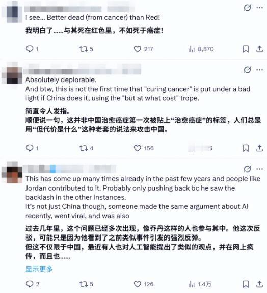 美国专家不装了:如果中国找到治愈癌症的方法,那将是我们的噩梦 要是某天清晨刷手机,突然弹出 “人类攻克癌症” 的推送,估计没人能坐得住。家里有过癌症病人的都知道,那不是病,是能把一家子拖进深渊的洪水。 倾家荡产买靶向药,看着亲人化疗后掉光头发,最后还是留不住人。真能治愈?那得是锣鼓喧天鞭炮齐鸣的大喜事,医院走廊得挤满哭着笑的人,全世界报纸头版都得印上 “人类胜利”。 但有人偏不这么想。美国播客节目《中国说》里,前国会 “中美经济与安全审查委员会” 委员莱兰・米勒,这位华盛顿的 “建制派国师”,被问到 “中国治愈癌症是不是好事” 时,想都没想就炸了毛:“这是美国的战略灾难!” 这话听得主持人都愣住了,合着救人命还分国籍? 米勒倒说得 “理直气壮”:关键不是救多少人,是供应链归谁管。中国要是握了治愈技术,美国就没了主导权,搞不好还会被 “卡脖子”。在他眼里,美国产业界必须是科技竞赛的赢家,哪怕全世界癌症患者在等死,也不能让中国递出解药。这种脑回路简直离谱,说句 “冷战活化石” 都算客气,分明是霸权思想钻进牛角尖了。 更重要的是,这还不是个别疯子的胡话。卡内基国际和平基金会的前高官埃文・费根鲍姆更直白,他在播客里吐槽:“真等中国治愈癌症,华盛顿一半人得喊‘肯定是偷的技术,临床试验造假’。” 听听,连基本的科学精神都不讲了,先给扣上 “偷东西” 的帽子,这操作跟当年污蔑华为一模一样。 这帮美国精英为啥这么慌?说白了就是怕丢了医药霸权的饭碗。美国占着全球近 40% 的处方药市场,强生、辉瑞这些巨头靠肿瘤药赚得盆满钵满。 就说默沙东的抗癌药 Keytruda,一年卖 294.82 亿美元,快占公司营收一半了。要是中国搞出治愈方法,这些 “药王” 不得立马变成废纸?每年几百亿的利润泡汤,医药行业的饭碗碎一地,这才是他们的 “噩梦” 核心。 更让他们坐不住的是,中国医药早就不是 “跟跑” 了。百济神州的泽布替尼,在美国的市场份额都冲到 BTK 抑制剂领域第一了,一季度光美国销售额就 40.41 亿元。 药明康德更厉害,美国四分之一的新药研发都有它参与,不少化疗药的核心成分全靠中国供应。以前美国还能靠技术壁垒压人,现在中国从研发到生产全链条突破,他们能不慌吗? 最滑稽的是,美国一边喊着 “中国威胁”,一边又离不开中国药企。去年美国 323 种药物短缺,化疗药都见底了,可 79% 的美国生物药企都跟中国有合作,想脱钩?行业协会说了,至少要 8 年才能替代。这就好比一边骂着厨子,一边抢着吃菜,吃不到还急眼。 美国网民都看不下去了。有网友在热帖下怼:“难道要‘宁可死于癌症,也要为自由世界战’?” 还有人戳破真相:“他们就是接受不了西方之外的人能创新,优越感塌了而已。” 这话说到点子上了。 曾几何时,美国还喊着 “攻克全人类难题”,现在倒好,眼里只剩 “能不能赢中国”,连救人都要分阵营,这哪是 “灯塔国”,分明是掉进霸权泥潭里爬不出来了。 其实米勒的话更像份 “病历单”,治不好癌症,倒暴露了美国的 “心病”:见不得别人好,把霸权看得比人命重。 中国 14 亿人里占了全球 26% 的癌症病例,搞抗癌研发本来就是为了救人,可在他们眼里,这成了 “威胁安全” 的原罪。这种反人类的逻辑,早就没了文明该有的样子。 现在美国一边通过《生物安全法案》打压药明康德这些中国企业,一边又怕中国先搞出治愈技术,简直是精神分裂。但他们忘了,科学进步从来挡不住。就像当年美国拦不住中国的 5G,现在也拦不住中国抗癌研发的脚步。他们越慌,越说明中国走对了路。 要是真有那么一天,中国先攻克癌症,肯定不会像美国那样攥着技术漫天要价。毕竟治病救人不是争霸的筹码,这道理中国人懂,可惜华盛顿的精英们被霸权迷了心窍。他们的噩梦,其实是人类的好梦,等哪天霸权私心让位于共同福祉,才算真的文明进步。