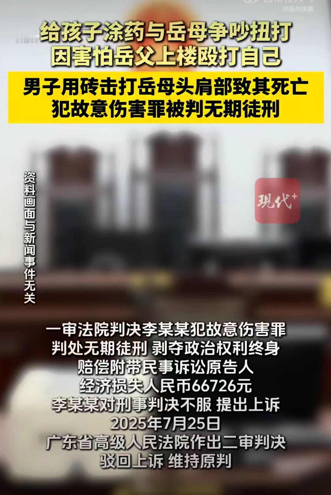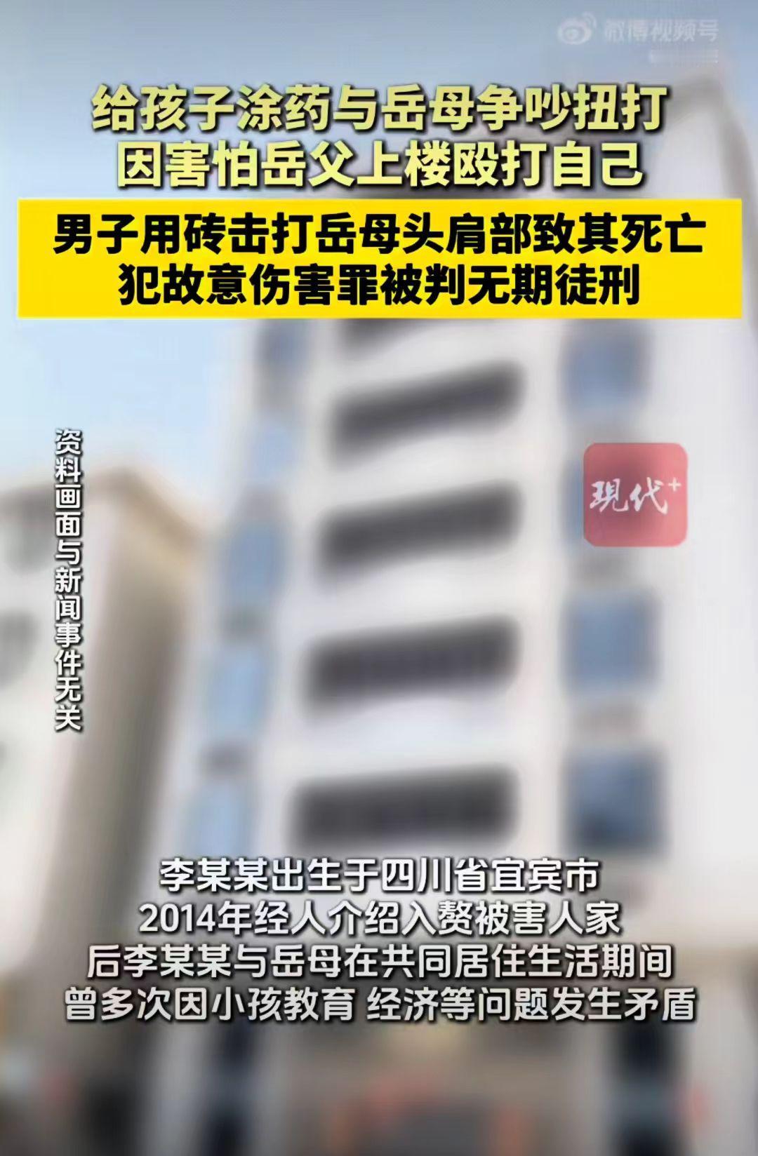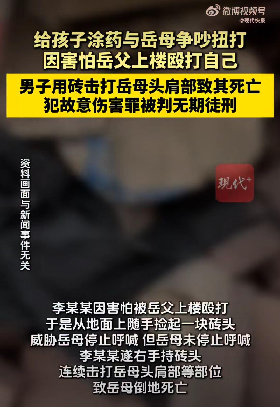女婿李先生因为给孩子涂药问题发生争执推搡,争吵时,岳母叫丈夫来帮忙,女婿害怕,就用砖头把岳母砸死了。 李先生是通过人介绍认识了妻子岑女士,相处之后,李先生和岑女士结婚,并入赘岑女士家。 2024年5月6日,李先生和岳母因为给孩子涂药,吵红了眼,两人便相互打了起来。 真的是难以想象,就是再生气吵架也不能动手啊!更何况是长辈呢? 岳母当时很是生气,觉得自己辛辛苦苦帮他带孩子,女婿还经常跟她吵打,这就明显的不尊重她,真是吃力不讨好。 岳母立即就叫楼上丈夫来帮忙,想着给李先生一个教训。 李先生很害怕,平时就因为孩子的教育等问题,和岳父岳母他们吵过闹过了,今天还动手了,就怕岳父下来会打他,于是李先生就拿砖头吓唬岳母冯女士。 岳母冯女士觉得女婿只是吓唬人并不会真的不敢打她,就没有停止呼喊,李先生一气之下就用砖头把岳母砸死了。 一次很小的家庭矛盾酿成一个悲剧,倒插门的婚姻里,上门女婿的自卑,矛盾的积压,毁掉了一个家庭。 法院一审判决李某某犯故意伤害罪,判处无期徒刑,并赔偿66726元。 李先生对刑事判决不服,提出上诉。广东省高级人民法院二审驳回上诉,维持原判。 丈母娘事件 女婿的下场 家暴女婿 家庭