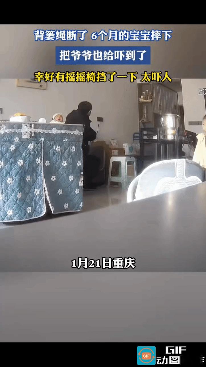 老人用背篓背宝宝,他先将左手套进背带,再将右手伸进背带,准备发力将背篓背起来时,背带突然断了。 宝宝从背兜里摔了出来,万幸地上有个摇椅,宝宝摔下来时被摇椅挡了一下,没有直接摔在地上。 老人吓了一大跳,慌忙抱起宝宝,不停地安抚。 虽然是背带绳自己断了,跟老人没有太大关系。 但这件事还是给老人提了个醒,用背篓背小孩时,一定要先检查检查两根背带是否牢固,尽量避免这种意外发生。 在四川一些山区和农村地区,还有这种用背篓背小孩的传统育儿方式。 背篓通常是由竹子编织而成,外部镂空,轻便透气,底部和四周会铺设软布作为垫衬,确保孩子待在里面舒适。 这种背法既方便家长从事劳动,又能让孩子贴近父母,获得安全感。