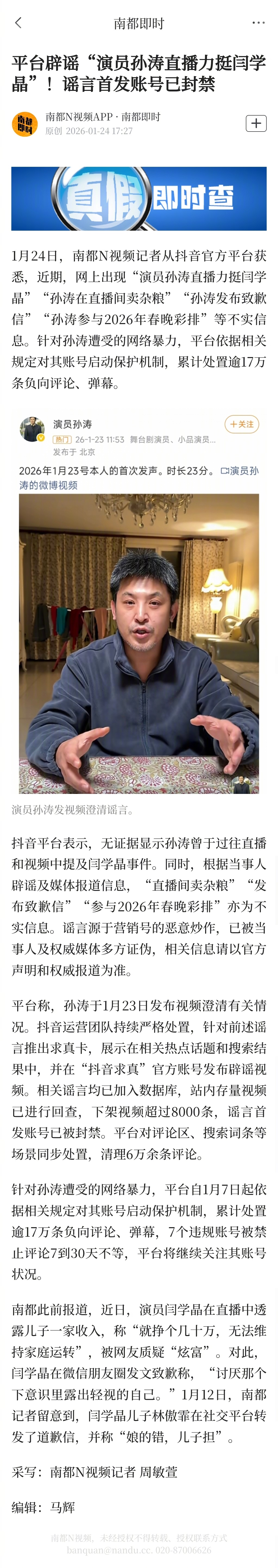#平台辟谣演员孙涛直播力挺闫学晶#【平台辟谣“演员孙涛直播力挺闫学晶”!谣言首发账号已封禁】1月24日,南都N视频记者从抖音官方平台获悉,近期,网上出现“演员孙涛直播力挺闫学晶”“孙涛在直播间卖杂粮”“孙涛发布致歉信”“孙涛参与2026年春晚彩排”等不实信息。针对孙涛遭受的网络暴力,平台依据相关规定对其账号启动保护机制,累计处置逾17万条负向评论、弹幕。抖音平台表示,无证据显示孙涛曾于过往直播和视频中提及闫学晶事件。同时,根据当事人辟谣及媒体报道信息,“直播间卖杂粮”“发布致歉信”“参与2026年春晚彩排”亦为不实信息。谣言源于营销号的恶意炒作,已被当事人及权威媒体多方证伪,相关信息请以官方声明和权威报道为准。平台称,孙涛于1月23日发布视频澄清有关情况。抖音运营团队持续严格处置,针对前述谣言推出求真卡,展示在相关热点话题和搜索结果中,并在“抖音求真”官方账号发布辟谣视频。相关谣言均已加入数据库,站内存量视频已进行回查,下架视频超过8000条,谣言首发账号已被封禁。平台对评论区、搜索词条等场景同步处置,清理6万余条评论。针对孙涛遭受的网络暴力,平台自1月7日起依据相关规定对其账号启动保护机制,累计处置逾17万条负向评论、弹幕,7个违规账号被禁止评论7到30天不等,平台将继续关注其账号状况。南都此前报道,近日,演员闫学晶在直播中透露儿子一家收入,称“就挣个几十万,无法维持家庭运转”,被网友质疑“炫富”。对此,闫学晶在微信朋友圈发文致歉称,“讨厌那个下意识里露出轻视的自己。”1月12日,南都记者留意到,闫学晶儿子林傲霏在社交平台转发了道歉信,并称“娘的错,儿子担”。