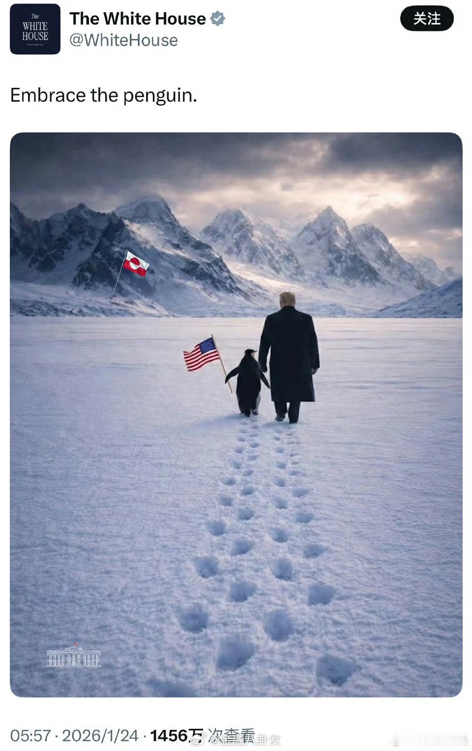 白宫晒特朗普格陵兰牵企鹅照翻车AI回答:格陵兰岛没有企鹅
