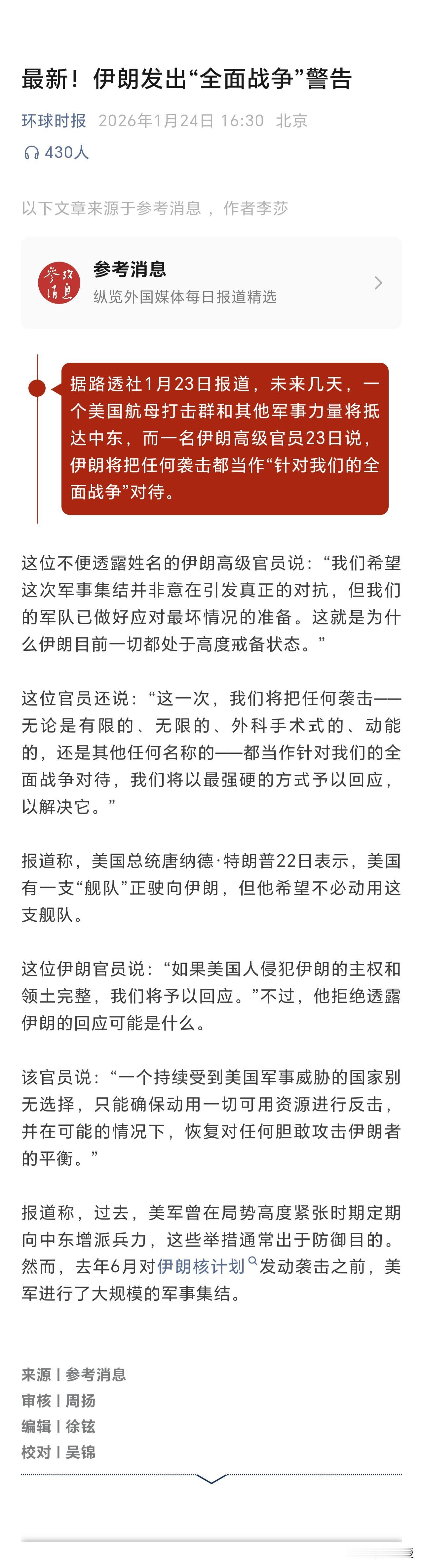 guangnu2008 19 2026-01-25 07:25 伊朗扛不住美国的常规作战的,唯一有效威慑只有核弹,你说伊朗能如何反抗? 换成是你,你会如何选? 如果是我的话,反正我都要死了,我就拉全世界给我垫背,把所有核弹全部放出去,能不能打到美国本土我不知道,反正放出去炸了就行。 用户13xxx54 回复 01-25 10:49 他有个屁的核武器啊 老D 回复 01-25 10:48 面对美国,伊朗有胜算的是核弹[哭笑不得],你昨晚梦见梁静茹了吗
