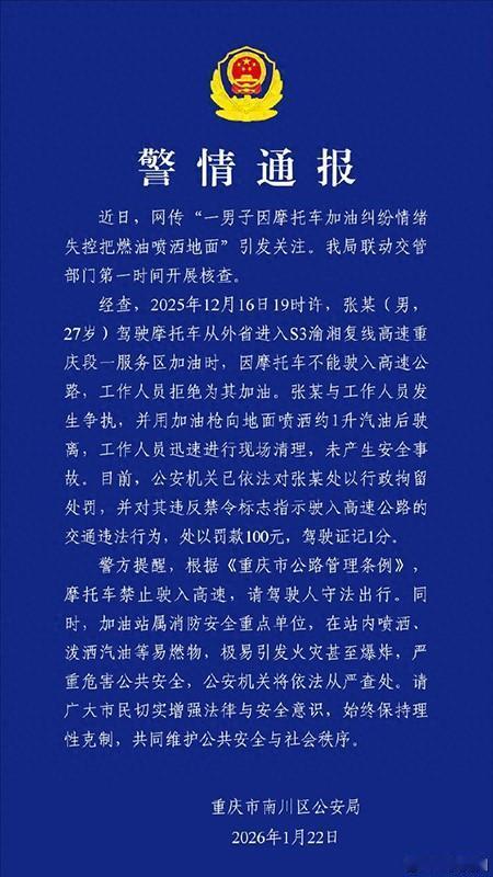男子在高速服务区非要给摩托车加油,加油员劝阻:“你要先报备公安,别为难我!”可是男子不听劝,把油直接喷在地上!网友:这男的真不是个爷们,为难一个小姑娘!这规矩又不是她定的! 眼看着加油站小姑娘苦苦哀求"求你别为难我,我会丢工作的",他非但不听劝,反手就把油枪对准地面一顿狂喷!不过,这事儿可没表面上看着那么简单,背后牵扯出的规定,更让人细思极恐。 1月22日,重庆南川警方的警情通报将这起发生在S3渝湘复线高速服务区的闹剧公之于众。回溯到2025年12月16日晚7点左右,27岁的张某驾驶摩托车跨省驶入重庆段,坚持要给车加油。但这在重庆可是行不通的根据《重庆市公路管理条例》,摩托车严禁驶入高速。既然违规闯入,工作人员自然只能按章办事予以拒绝。 这一拒绝不要紧,张某瞬间情绪失控,抓起加油枪就向地面疯狂喷射,据通报统计,喷洒的汽油量足足有约1升!要知道,加油站属于消防安全重点防护单位,哪怕一丁点明火或静电,都可能瞬间引发爆燃,这简直是在拿整个服务区的安全开玩笑。 更加恶劣的是,根据现场情况和监控显示,就在工作人员慌忙处理地上的汽油隐患时,这名男子竟然趁乱偷偷给自己的摩托车加了油,随后扬长而去。法网恢恢,疏而不漏。目前,公安机关已依法对其作出行政拘留处罚。针对其违规驶入高速这一交通违法行为,亦开出罚单,处以100元罚款,驾驶证记1分。 说穿了,这分明展现出一副无赖嘴脸,秉持着“我若不痛快,便让他人皆难安”的扭曲心态,尽显蛮横无理之态。 回看现场视频,那位女加油员的声音里已经带上了哭腔,她反复哀求道:“你想让我丢工作吗?不是一点的问题,你没有报备,我不敢呀。”可张某对这些解释充耳不闻,理直气壮地回怼:“我就加5块钱!下个路口就下高速了,至于这么麻烦?” 眼见对方情绪激动,小姑娘急得连说带比划,试图给出解决方案:“我跟你说了,你给公安局打个电话,报备一下!” 结果张某冷笑一声,完全不接茬:“那你打啊!关我什么事?”随后更是放出狠话:“你不加是吧?“那我就滋地上!”言罢,他当即将油枪开关按下。顷刻间,刺鼻的汽油如注般倾泄而下,在地面上迅速蔓延开来。 此招着实阴损至极。他自恃是在“维权”或是宣泄愤懑,却不知这无异于一场以众人生命安全为赌注的疯狂豪赌,实在是愚蠢又危险。 视频甫一曝光,网络舆论场刹那间喧嚣鼎沸。如巨石投入平静湖面,激起千层浪,各方声音纷至沓来,瞬间炸开了锅。 有人痛斥这是“巨婴”行径:“自己违规上高速在先,不提前检查油箱,反而怪工作人员不通融?这哪里是爷们儿干的事?规矩又不是小姑娘定的,你拿她撒什么气?” 还有不少网友呼吁严惩:“在加油站这种高危场所故意喷洒汽油,这已经涉嫌以危险方法危害公共安全了!必须予以重判,绝不能姑息!” 不过,在一片谴责声中,也有冷静的声音开始审视制度本身:“摩托车允许生产、允许售卖、允许上路,怎么一到加油环节就得找公安报备?国道上随便加,一上高速就要层层审批,这其中的逻辑难道不矛盾吗?” “小姑娘确实冤枉,她不过是忠实执行公司的规定,却成了制度与现实冲突的‘夹心饼干’。真正应该被问责的,是这套让合法车辆陷入‘能上不能加’困境的僵化流程。”坦白讲,这起事件确实是一个巴掌拍不响,两头都有病灶。 男子的极端行为无疑是大错特错。在易燃易爆区域故意泼洒汽油,别说什么“只喷了1升”,哪怕是一滴油遇上静电火花,后果都不堪设想。在他那句“我就加一点”的借口背后,是彻头彻尾的极端利己主义——为了自己的便利,可以无视他人的饭碗,更可以践踏公共安全的底线。 但管理制度上的锅,也确实甩不掉。既然重庆高速明令禁止摩托车通行,那为何车辆还能顺利驶入服务区?既然要禁,为何不在高速入口处就实施有效拦截?非要等到车主跑到了服务区、油箱见底了,才冷冰冰地告知“必须报备才能加油”——这难道不是在逼着人要么推车徒步几十公里,要么当场情绪崩溃破罐子破摔吗? 更为荒诞的是,同样的交通工具,在国道加油站畅通无阻,一旦驶入高速就变成了“需要特批的危险分子”。真正人性化的安全管理,应当是疏堵结合:设立摩托车专用加油位、优化线上快速报备流程、明确界定哪些路段无需繁琐审批而不是让拿着微薄薪水的小姑娘,替不合理的制度充当人肉挡箭牌。 如今,张某已被拘留,油站的现场也清理干净,事情看似画上了句号。可是,那些骑着合法手续摩托车、本想遵纪守法却被困在高速上进退维谷的车主们,下一次遭遇同样的窘境,又该何去何从? 倘若规则缺乏基本的人性温度,便容易催生极端的暴力。倘若制度拒绝灵活变通,终将逼出更多的“泼油男”。 严惩危害公共安全的行为固然正确,但优化那些荒诞的规则同样刻不容缓。否则,下一个在寒风中瑟瑟发抖的加油员,依然会被推到风口浪尖上,替缺失的管理机制买单。 (来源:凤凰网)
