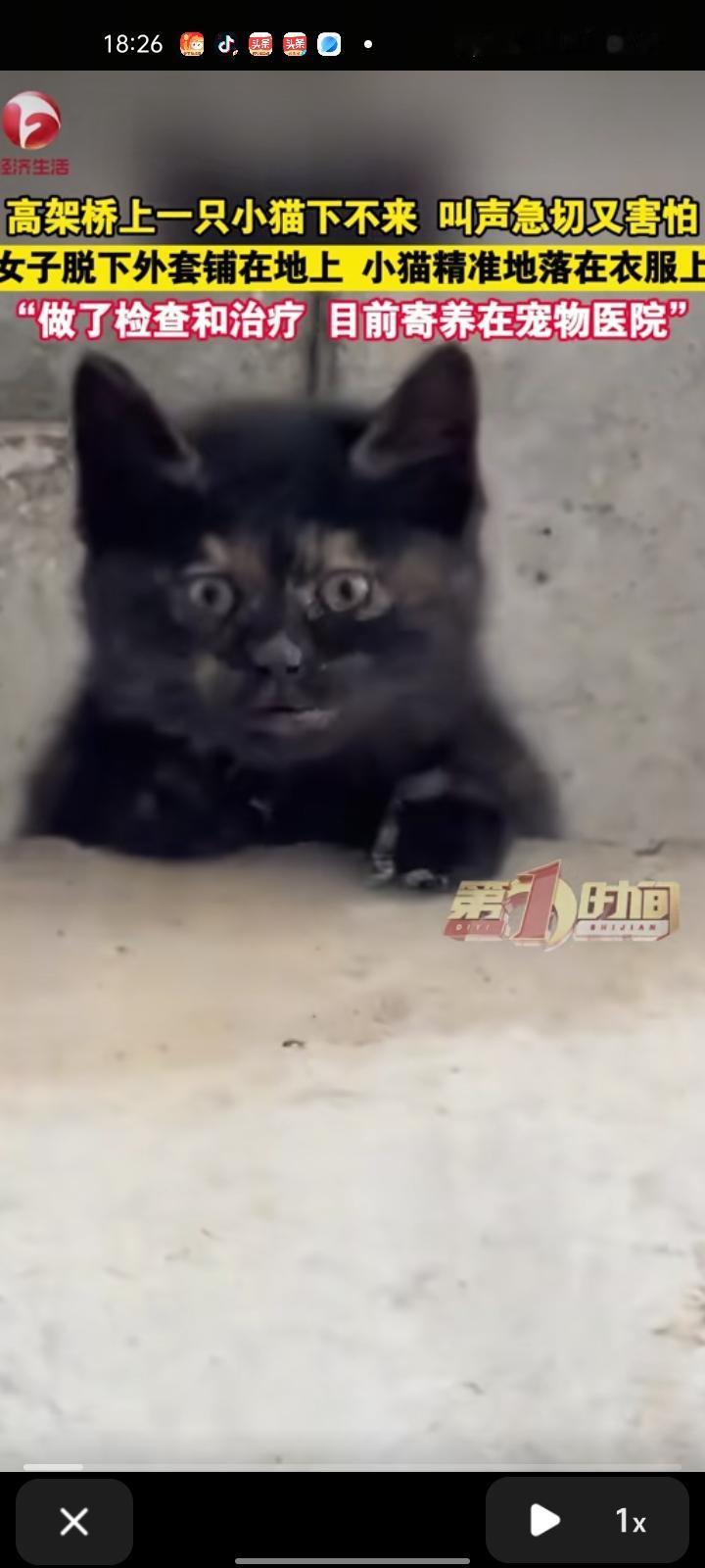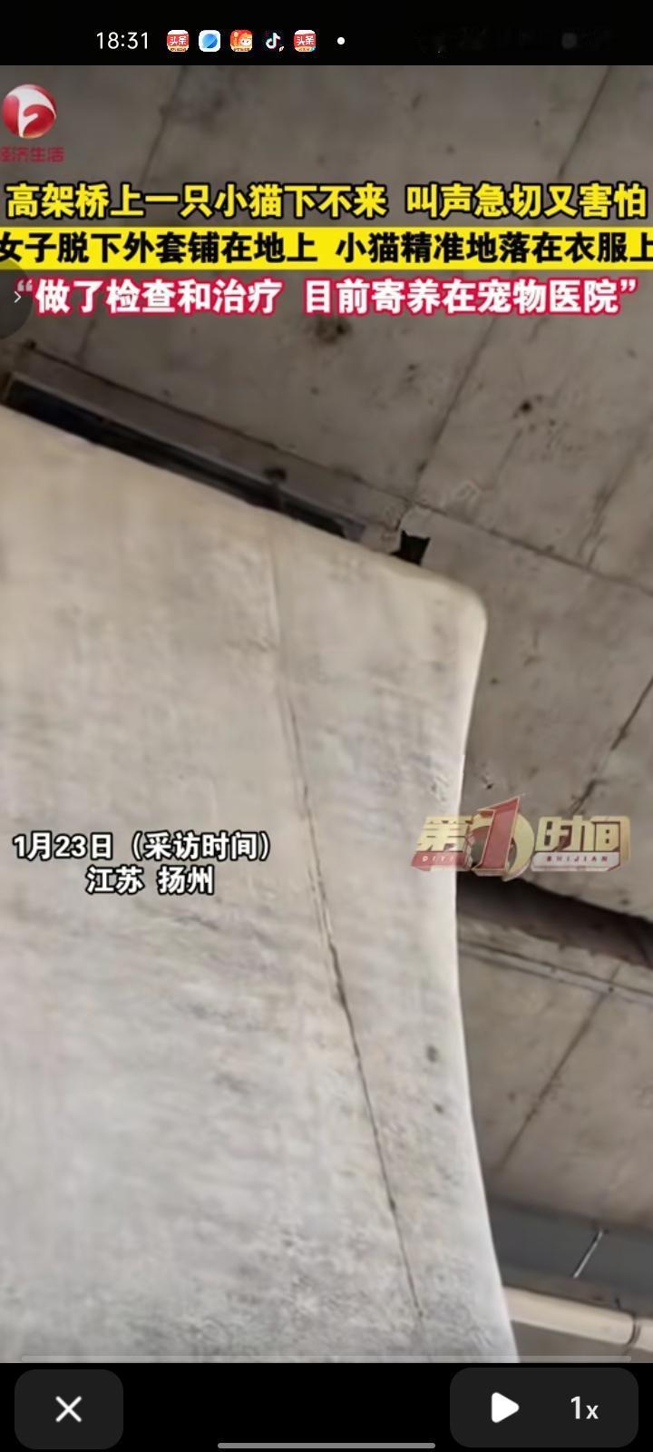 1月21日,江苏扬州。女子发视频表示,上班途中听见猫叫,然后看到高架桥上有只小猫下不来,叫声急切又害怕,想往下跳都不敢。随后,自己脱下外套铺在地上,小猫精准落在衣服上,只是不小心把手机碰到了,没拍到小猫跳下来的画面。 把小猫送到宠物医院后,医生给它做了检查,也打了疫苗,清洗了破损的口腔,目前寄养在宠物医院