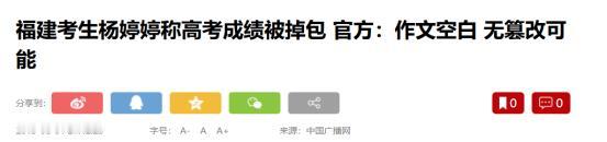谁“篡改”了她的高考分数?2013年8月3日,福建省教育考试院连夜翻考卷!只因一女生高考志愿落榜,成绩仅有364分,却坚称自己考了586分! 对于普通家庭的孩子来说,高考是少有的,不看出身,家境,背景的统一选拔渠道。翻身有很多条途径,但高考是唯一一个最便捷,最为公平的选择。 所以当发现高考分数跟自己预测出现差距时,有部分考生就接受不了,称自己高考成绩被掉包了。2013年的时候,就一起类似事件引发广泛关注。 在当时高考结束之后,来自福建的考生杨婷婷在个人社交账号发文称,高考分数出来之后,查到总分为586分,根据这一分数进行了志愿填报。但是当她再次查询录取结果的时候,却发现自己的总成绩变成了364分,直接少了222分。 这件事情立即成为国人关注的焦点,不少网友要求严查此次事件。受舆论影响,2013年8月3日晚的时候,福建省教育考试院连夜翻找了杨婷婷的试卷原卷。在经过多方审查以及同扫描卷核对之后,确定没有任何的区别,不存在篡改高考成绩的行为。 据官方消息显示,杨婷婷的语文试卷作文空白,根本就没有篡改的可能。事件的这一反转,出人意料,但又在人意料之中。因为在事件发生之后,就有不少网友对杨婷婷发出了质疑。 杨婷婷是已经三战高考,如果她有这个实力,早已经上岸,又何必会出现三战的情况。所以从始至终,这件事情就是由杨婷婷自身编造。 对此,您怎么看?欢迎评论区留言您的看法,我们一起讨论一下。 (信息来源:福建考生杨婷婷称高考成绩被掉包 官方:作文空白 无篡改可能-中国广播网)