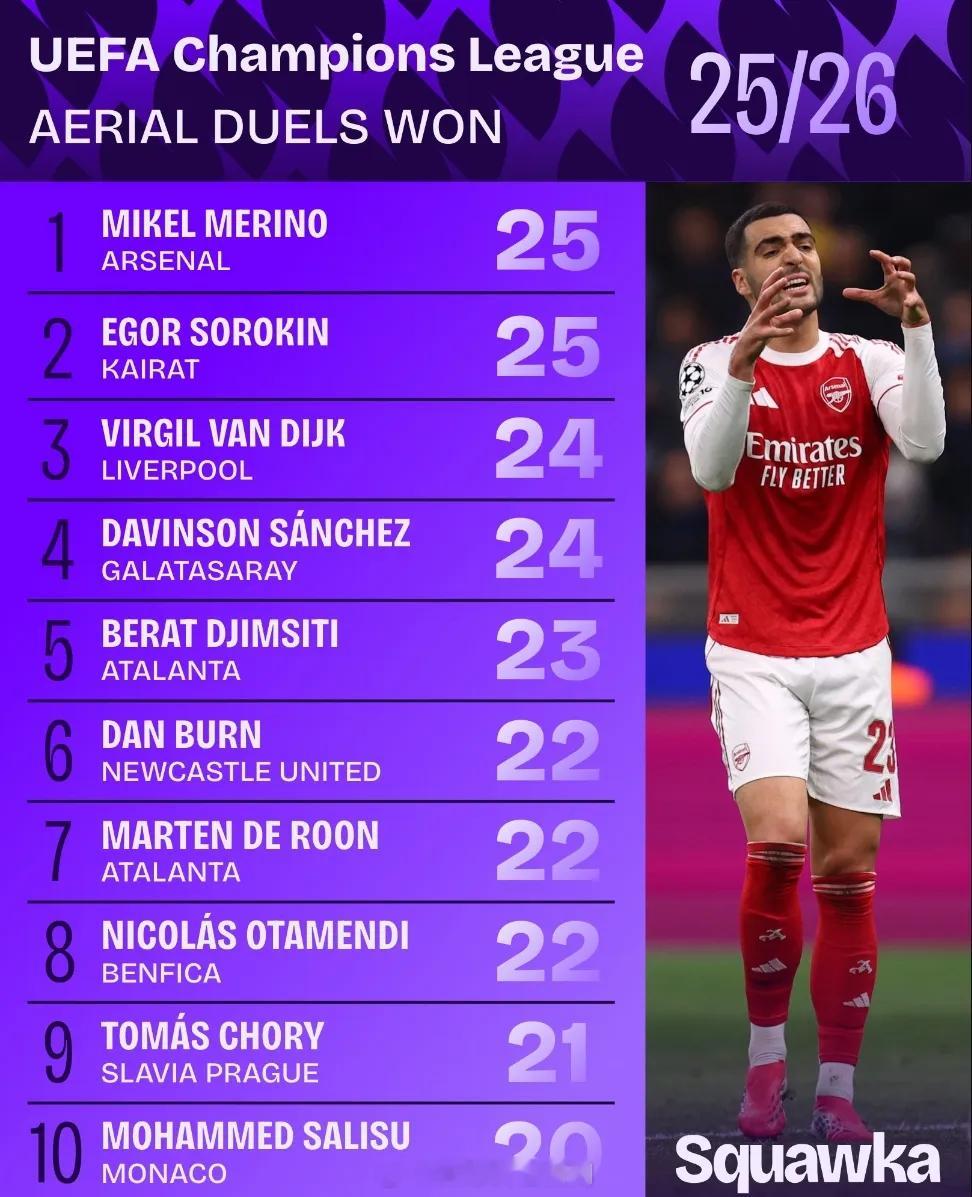 阿森纳 Squawka统计,本赛季欧冠至今为止争顶成功次数最多(并列)的球员是梅里诺:25次。阿森纳