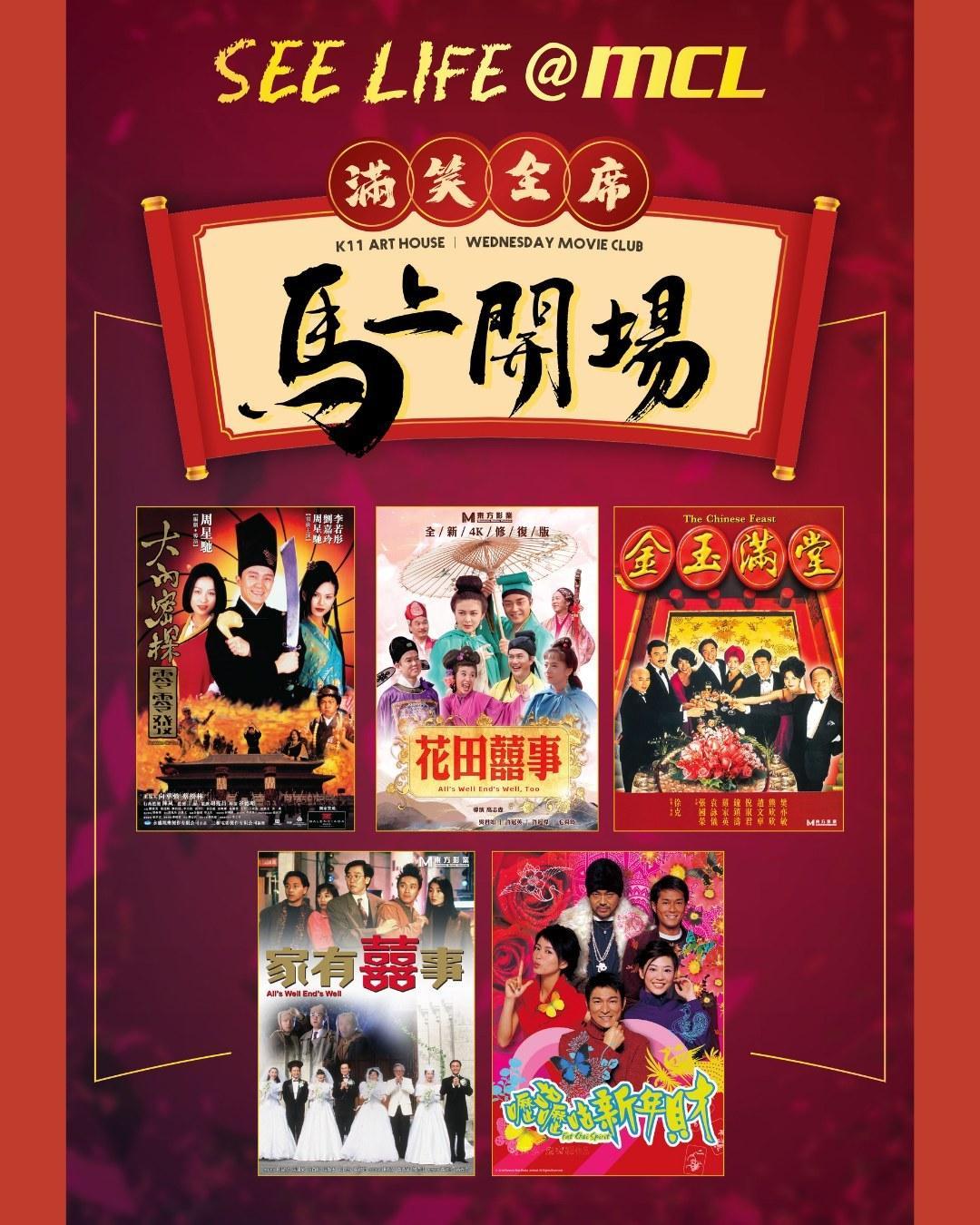 香港影讯 MCL Wednesday Movie Club:满笑全席马上开场K11 Art House Wednesday Movie Club 精選5部闔家都可以睇到捧腹大笑嘅港產片經典,同大家一齊送蛇迎馬🐎 更以賀年經典票價HKD8️⃣8️⃣開售🧧㊗️ 祝 家家有囍事🤩《家有囍事》(4K修復版)1月28日 (三) 19:45📍K11 Art House .🧧㊗️ 人品好 馬年自然好🀄《嚦咕嚦咕新年財》 (WMC)2月4日 (三) 19:50📍K11 Art House .🧧㊗️ 大內密探齊齊發🏆《大內密探零零發》(WMC)1月31日 (六) 13:00📍K11 Art House 2月8日 (日) 12:40📍K11 Art House .🧧㊗️ 花田開富貴🌺《花田囍事》(4K修復版)2月1日 (日) 12:30📍K11 Art House 2月7日 (日) 15:15📍K11 Art House .🧧㊗️ 金玉滿堂豐衣足食😋《金玉滿堂》(4K修復版) 🌟香港戲院首映2月11日 (三) 19:50📍K11 Art House 2月13日 (五) 19:45📍K11 Art House 2月14日 (六) 12:40📍K11 Art House
