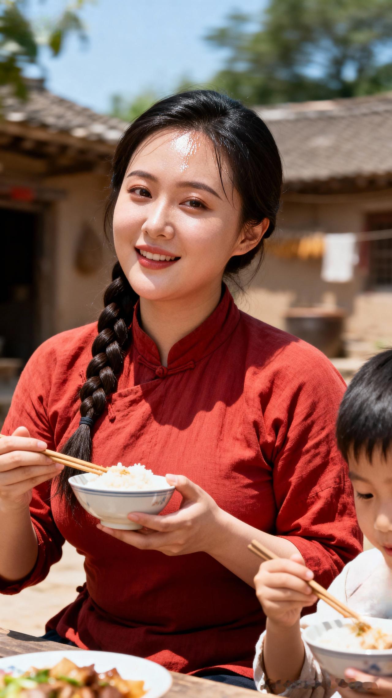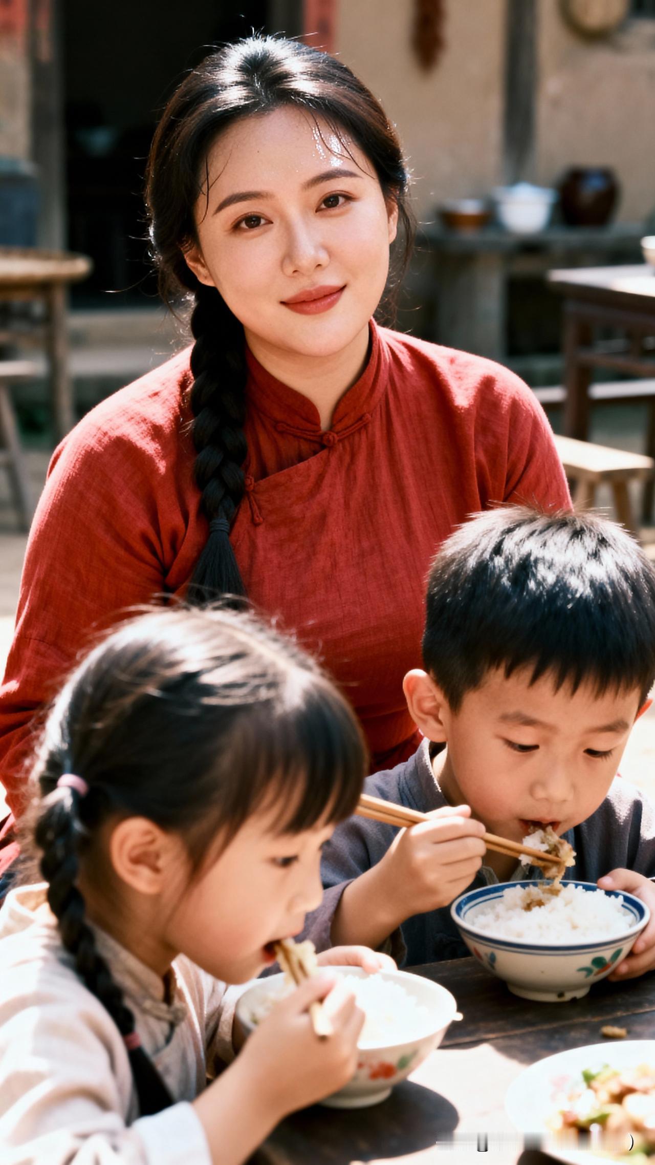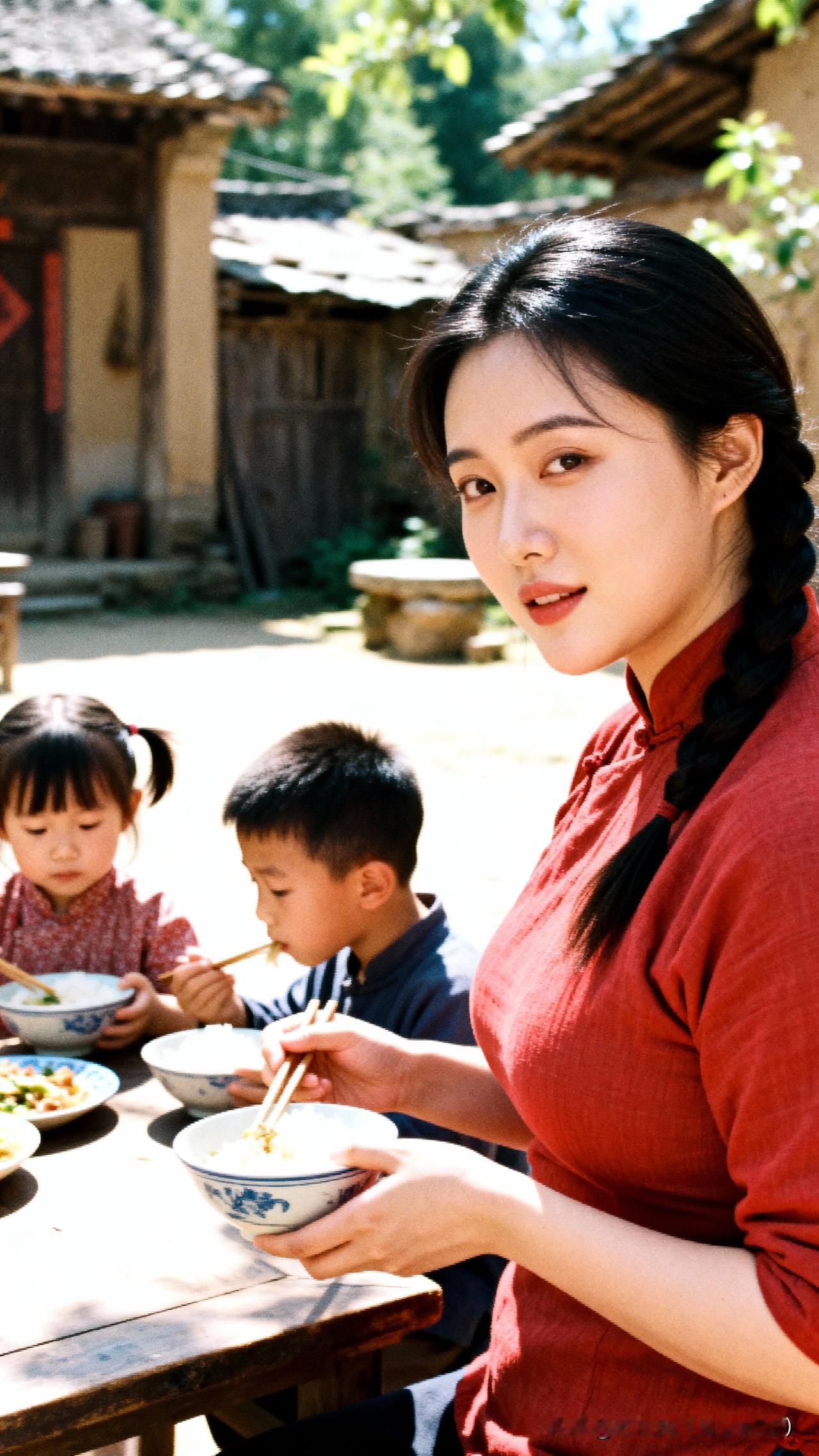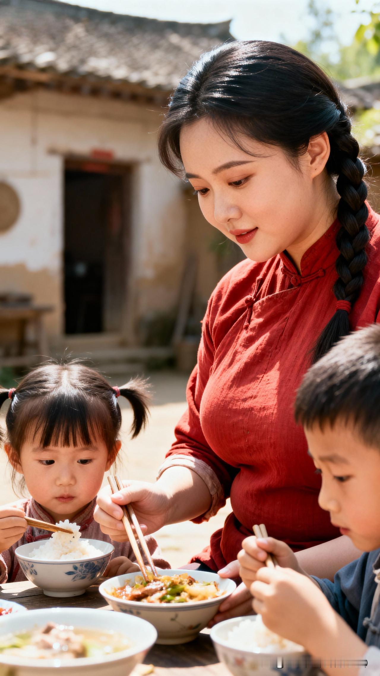 红衫娘,粗瓷碗,藏着“耕读传家”的朴素信仰 正午的日头晒得土坯墙暖烘烘的,红衫娘的额角挂着细汗,手里的青花碗盛着刚焖好的白米饭。孩子们埋头扒饭的样子,像极了老辈人嘴里念叨的岁月——没有花哨的吃食,没有精致的餐具,一碗热饭、一碟家常菜,就是最踏实的幸福。 那时候的日子,是在田埂上踩出来的,是在灶火里熬出来的。祖辈们扛着锄头下地,母亲们守着灶台添柴,一家人围坐在木桌前,就着暖阳扒完一碗饭,转身又要为生计奔波。粗瓷碗里盛的不仅是白米饭,更是中国人“耕读传家”的朴素信仰,是“国泰民安”最接地气的注脚。 从烽火岁月到太平盛世,中国人的家国情怀,从来都藏在这一碗热饭里。正是无数个这样的小家,用一碗碗热饭、一次次相守,撑起了民族的脊梁;正是无数个红衫娘一样的母亲,用一双双布满老茧的手,守护着万家灯火。 我们怀念的,从来不是粗瓷碗里的饭,而是那份被烟火气包裹的温暖,是一家人围坐在一起的热闹,是老辈人用双手撑起小家、守护大家的坚韧。这一碗饭,连着烟火人间,也连着山河家国;这一抹红,映着柴米油盐,也映着民族的生生不息。 这就是刻在中国人骨子里的浪漫:最珍贵的味道,从来不在珍馐宴席,而在老家的木桌上,在母亲的红衫影里;最深沉的家国情怀,从来不在豪言壮语里,而在每一顿热饭、每一次相守里。 乡土情怀 原创首发
