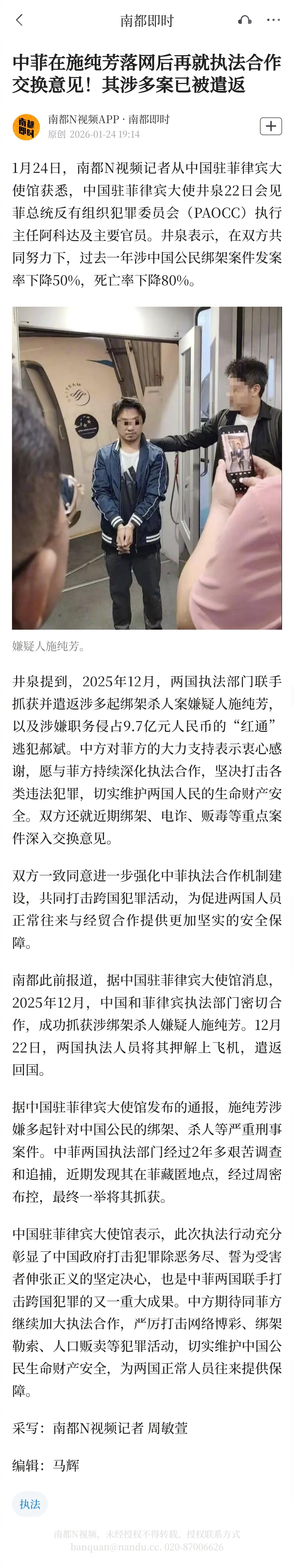 【#中菲在施纯芳落网后再就执法合作交换意见#!其涉多案已被遣返】1月24日,南都N视频记者从中国驻菲律宾大使馆获悉,中国驻菲律宾大使井泉22日会见菲总统反有组织犯罪委员会(PAOCC)执行主任阿科达及主要官员。井泉表示,在双方共同努力下,过去一年涉中国公民绑架案件发案率下降50%,死亡率下降80%。井泉提到,2025年12月,两国执法部门联手抓获并遣返涉多起绑架杀人案嫌疑人施纯芳,以及涉嫌职务侵占9.7亿元人民币的“红通”逃犯郝斌。中方对菲方的大力支持表示衷心感谢,愿与菲方持续深化执法合作,坚决打击各类违法犯罪,切实维护两国人民的生命财产安全。双方还就近期绑架、电诈、贩毒等重点案件深入交换意见。双方一致同意进一步强化中菲执法合作机制建设,共同打击跨国犯罪活动,为促进两国人员正常往来与经贸合作提供更加坚实的安全保障。南都此前报道,据中国驻菲律宾大使馆消息,2025年12月,中国和菲律宾执法部门密切合作,成功抓获涉绑架杀人嫌疑人施纯芳。12月22日,两国执法人员将其押解上飞机,遣返回国。