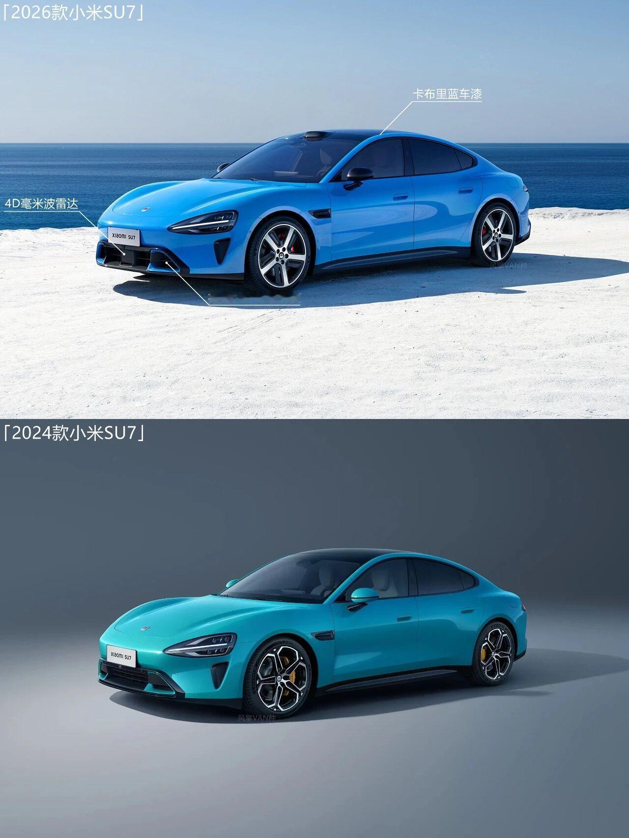 2026款小米SU7外观内饰对比解析预售价22.99-30.99万元,新一代小米SU7将于4月份上市。 2026款小米SU7在外观、内饰、底盘、动力、辅助驾驶系统方面均进行了升级调整。 外观部分,2026款小米SU7外观造型整体延续了2024款车型的设计,外观部分比较明显的变化包括前格栅内部结构调整、牌照框下方新增4D毫米波雷达、黑色外后视镜、新款20英寸锋刃轮毂以及全新卡布里蓝车漆。 内饰部分,2026款小米SU7内饰进行了重新设计,整体布局不变,但方向盘、副仪表台、座椅均有调整,新款SU7采用双色方向盘、方向盘多功能按键调整、副仪表台布局调整、杯架分区重新设计、座椅及门板缝线调整、车门应急机械拉手调整、氛围灯重新设计,同时提供全新暗夜黑内饰配色。 底盘部分,2026款小米SU7全系标配前四活塞固定卡钳及前245后265宽胎,PRO及MAX版标配闭式双腔空气悬架+CDC可变阻尼减振器。 动力部分,2026款小米SU7全系标配V6s电机,标准版及PRO版搭载752V高压平台,MAX版则搭载897V高压平台。续航方面,2026款小米SU7标准版/PRO/MAX版CLTC纯电续航分别为720/902/835公里。 辅助驾驶方面,2026款小米SU7全系标配激光雷达以及700TOPS算力Xiaomi HAD端到端辅助驾驶系统。