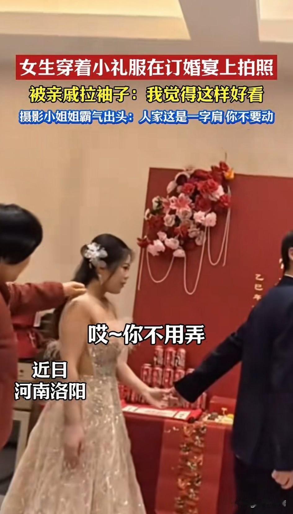 近日洛阳的婚宴上出现了这一慕,新娘小姐姐穿着小礼服,准备在婚宴上拍摄照片! 不然旁边的亲戚走了过去,然后去她的肩带提了上去,可能是好心!因为她没有见过这样穿的! 结果遭到了摄影小姐姐的霸气反击打,直接提醒她,人家这是一字肩,你不用弄! 小姐姐本来有点儿委屈,但是碍于长辈,她又没有阻止,幸亏摄影小姐姐及时出手! 这才让她如愿排上了自己喜欢的照片,有的时候长辈管的比较宽,总觉得露一点就伤风败俗!实际上有些衣服就是这么穿的! 大家只是正常穿着而已,有些长辈已经落伍了,还拿老眼光对待年轻人,大家都觉得露肩装好看吗? 洛阳 晒出你梦中的婚礼 婚礼拍照 露肩婚礼自拍