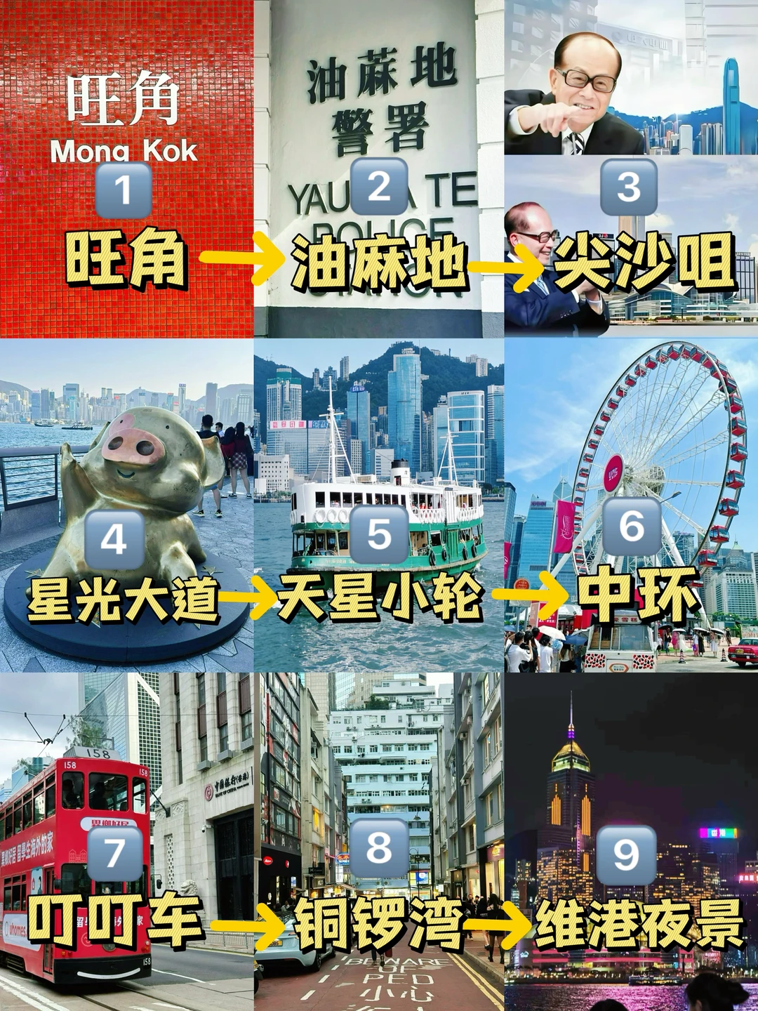 旺角➡️油麻地➡️尖沙咀➡️星光大道➡️天星小轮➡️中环➡️叮叮车➡️铜锣湾➡️维多利亚港