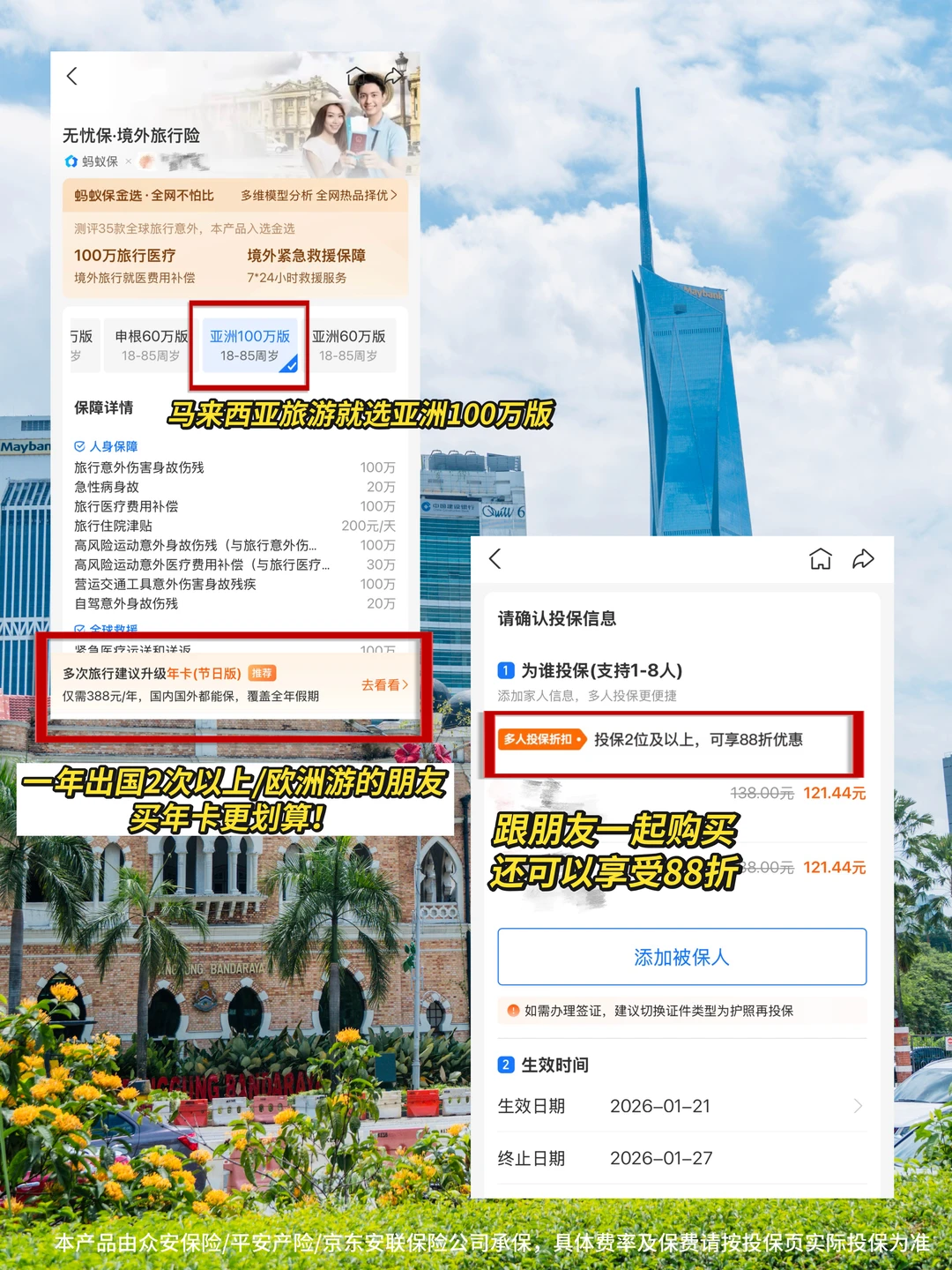 除了马来西亚,像新加坡、泰国等亚洲地区,法国、瑞士、意大利等申根地区以及美国、英国、澳大利亚等全球地区都在保障范围内!大家选定出发地之后,可以根据自己需要选合适的版本,我去马来西亚买了亚洲100万,你们也可以咨询客服,一定要出境前买!