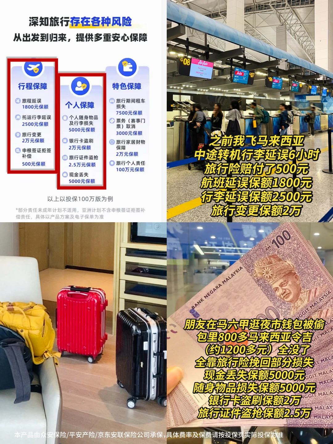 听说过太多东南亚财物丢失的案例了,没想到有一天也给我们碰到了,在马六甲逛夜市时,朋友被偷了钱包👛,包里800多马来西亚令吉(约1200多元)全没了,好在旅行险能挽回部分损失,它有现金丢失保额5000元,随身物品损失保额5000元,银行卡盗刷保额2万,旅行证件盗抢保额2.5万。出国玩带东西多的姐妹,一定要备上!
