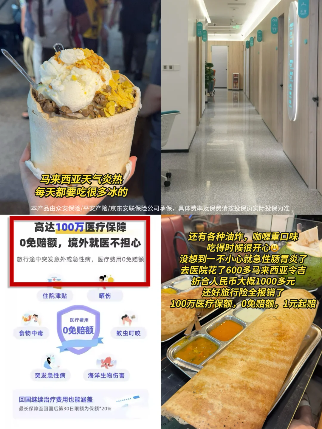 马来西亚天气比较热🌞,每天都要喝好多冰饮吃冰淇淋,当地又比较多重油重口味的美食,还有榴莲各种热带水果每天都炫个不停,吃的时候很开心,只是我的广东胃实在太脆弱啦,一下子就吃出了急性肠胃炎,去医院花了600多马来西亚令吉(约1000多元),还好提前买了旅行险,它有100万医疗保额,0免赔额,1元起赔,申请赔付整个流程简单又快捷!