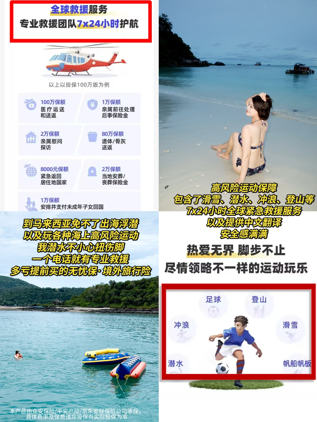 兰卡威出海潜水,玩海上项目香蕉船、快艇、浮潜🤿都有一定风险,还好旅行险有高风险运动保障,潜水滑雪登山冲浪都能保,还有7*24 小时全球紧急救援服务,带中文翻译,我这次潜水不小心扭伤脚,一个电话就有专业救援,真的超安心😌