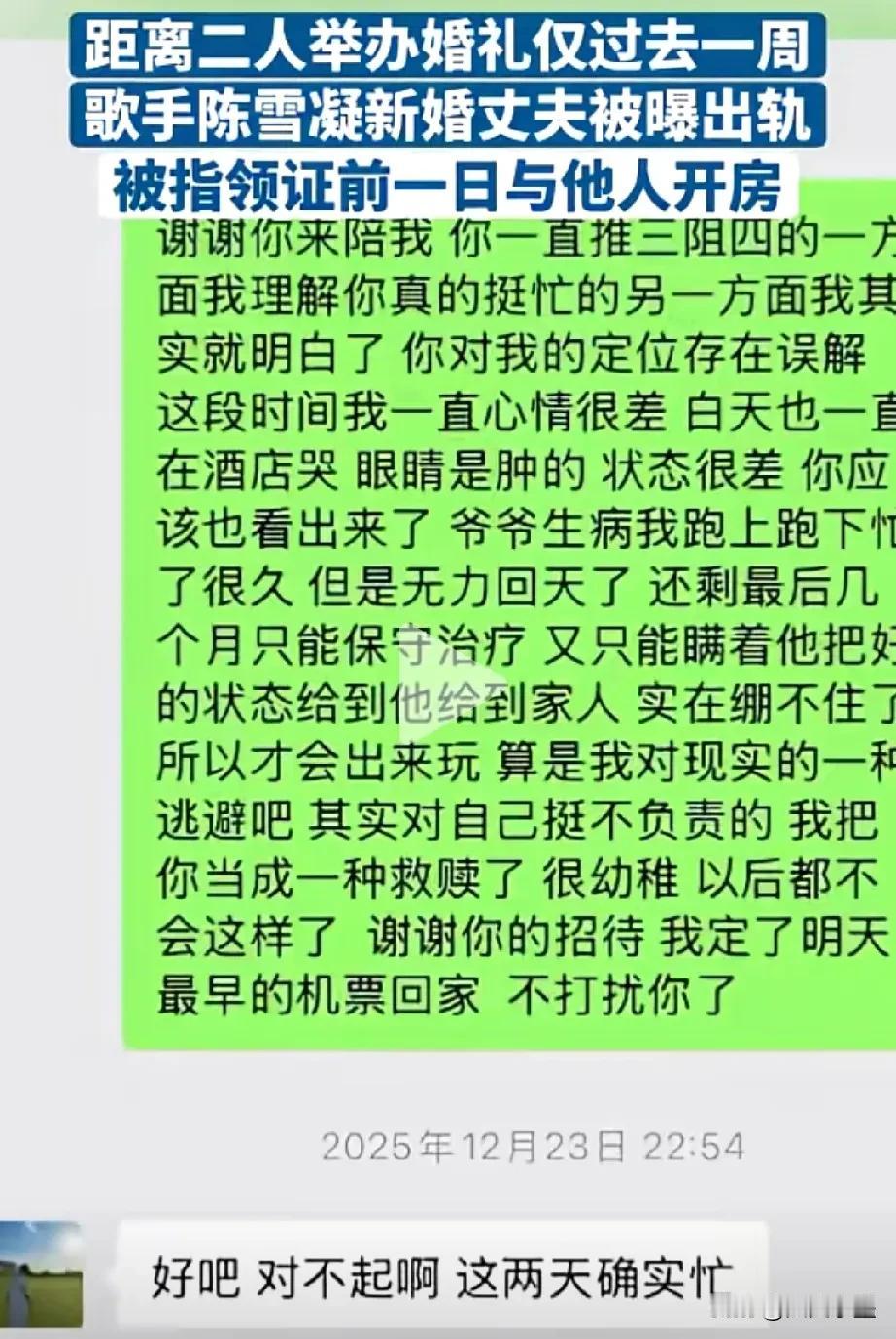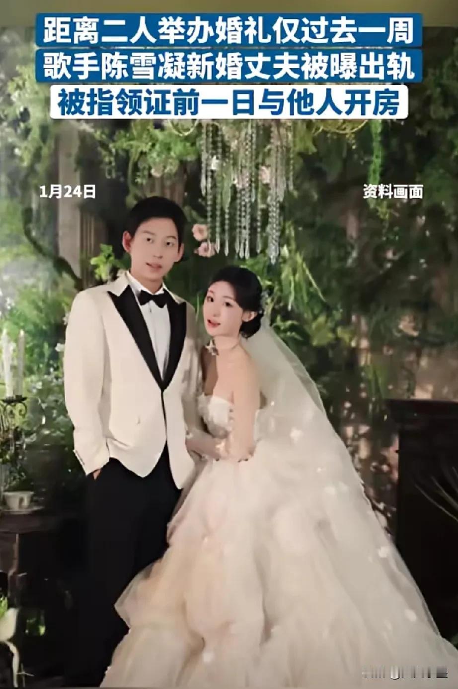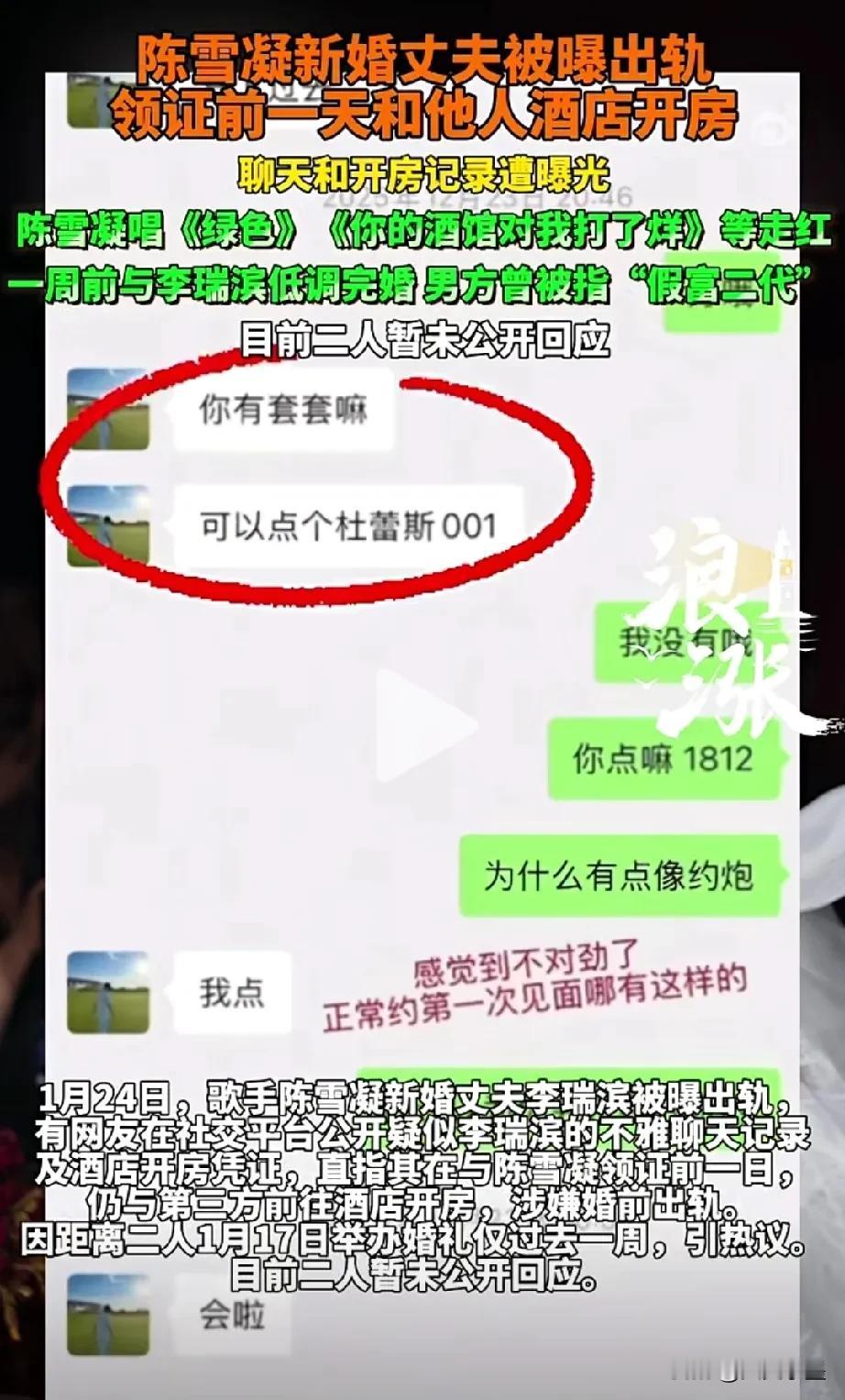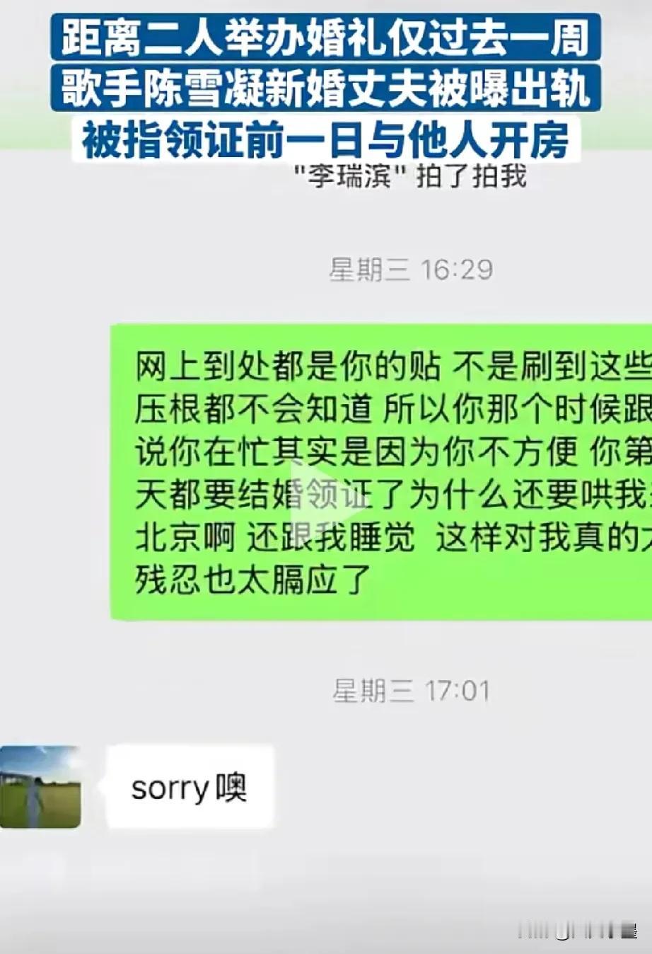新婚前一夜还出轨别人,脚踏两只船对的起你老婆陈雪凝吗? 1月17日,陈雪凝与丈夫李瑞滨刚刚在山西举行婚礼,这才过了不到一周的时间,其丈夫李瑞滨就被曝出轨,而且还是在新婚前一天跟别人约的! 原来,他早就跟这女的有一腿了,这女的也是受害者,被李瑞滨骗了,她不知道李即将结婚的事才来找他的。 结婚的时候,当陈雪凝唱着《约定》走向李瑞滨时,估计不会想到他的丈夫原来是这样的人吧!人心隔肚皮啊!