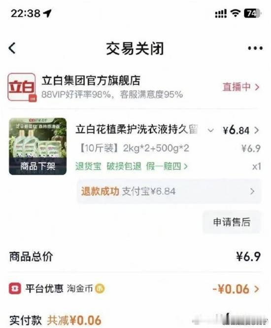6.9元买10斤立白洗衣液被强制退款1月22日,多位消费者在社交平台投诉,在立白官方旗舰店低价购买的商品遭强制退款,原因系立白方面错标价格,多位消费者质疑品牌方“玩不起”。据网友提供的订单截图显示,10斤装的立白花植柔护洗衣液标价6.9元,目前商品页面显示“商品下架”。目前,店中同款10斤装的立白花植柔护洗衣液售价90.8元,券后77.9元。1月23日,立白官方客服表示,因价格过低,订单无法发出,已为消费者补偿5元现金红包。同日,立白相关负责人表示,此次问题源于内部运营审核疏漏,对给消费者造成的不便与失望,立白诚恳致歉,公司已启动流程升级,将全面加强价格校验、增加多岗复核,杜绝此类问题。上海兰迪(广州)律师事务所执行主任孔云飞表示,根据《民法典》的规定重大误解的合同是可以撤销的。随着电商行业发展,近年来不时出现因为商家操作失误、系统运行错误等原因导致商品价格错误而发生的争议,结合现有司法判决和相关法律规定,商家优惠价格设置错误,是可能构成重大误解而撤销合同(取消订单)。