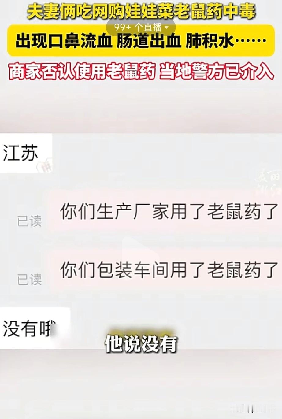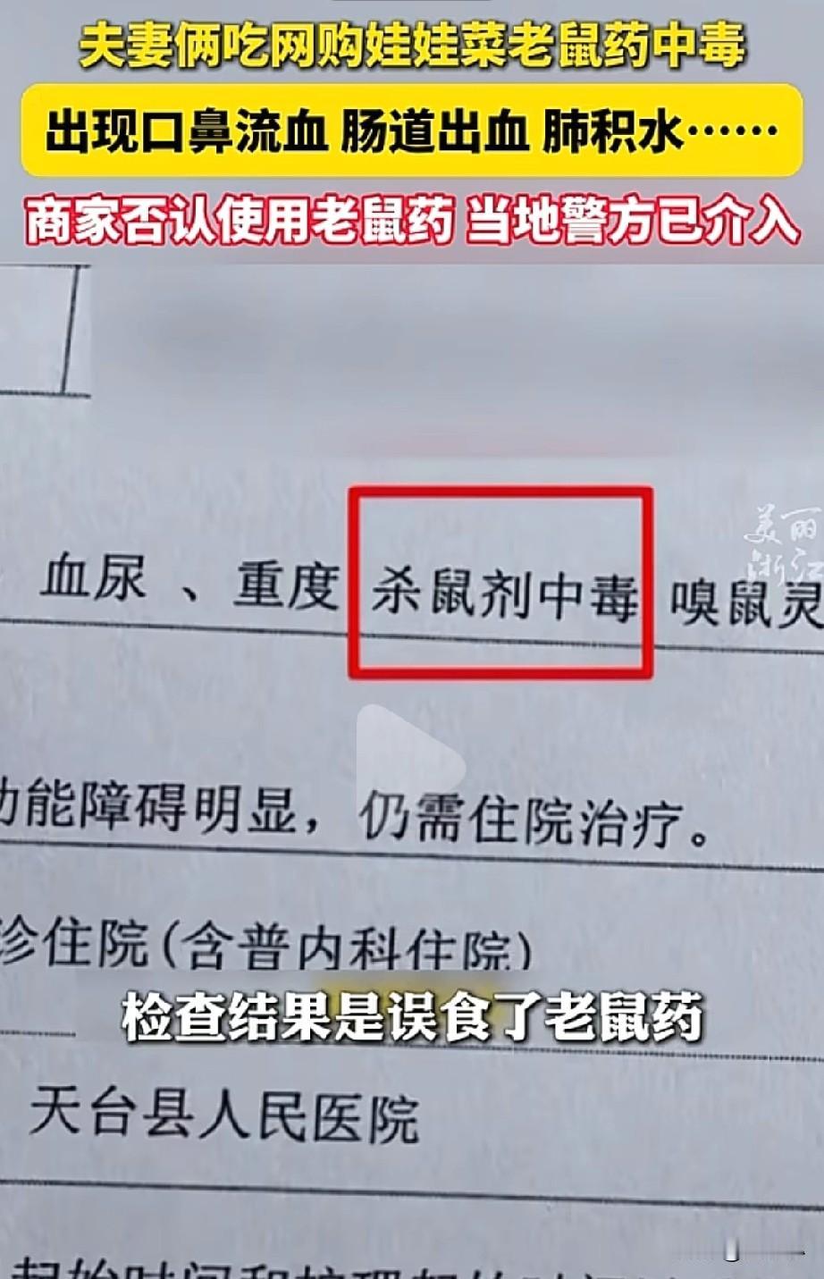 “太吓人了,网购需谨慎了!”你能想象的到吗?网购娃娃菜,竟然吃中毒了,出现了口鼻流血,肠道出血,肺积水…… (信息来源:美丽浙江) 事情发生在浙江台州,杨女士在网上购买了娃娃菜回来,夫妻俩吃完后没多久,就开始有点不对劲,一直到现在了第二天后就开始流鼻血,接着就嘴巴里面起了血泡,一直都流血不止。 两人立马来到医院检查,医院的报告上写着,是中毒了,里面含有老鼠药成分,杨女士就怀疑上了狠网购菜有关系。 杨女士就询问商家,但商家却否认,自己售卖的菜并没有老鼠药,商家觉得杨女士就是在敲诈他,如果自己卖的菜真的有老鼠药的话,警方也会联系自己的。 此事引发热议! 有的网友表示:为啥咋感觉有点像敲诈呢?毕竟吃的时候也洗了好几回,又用清水煮了,下单的又不止她一个客户,如果真有证据的话,直接报警起诉就行了。 也有网友表示,商家会傻到,放老鼠药?我也在网上买菜,目前挺安全的。 所以, 最好是查清楚,不要让无辜的人受伤,也不要让无辜的人背锅。