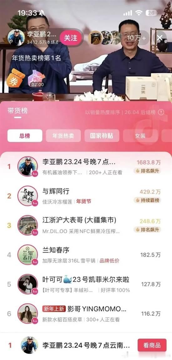 李亚鹏带货登总榜第一 90分钟销售额破5000万元近期,李亚鹏发布视频,公开北京嫣然天使儿童医院房租债务一事,随即引发广泛关注。事件曝光后,网友自发开启了一场“爱心汇聚行动”,纷纷以实际行动支援。1月23日晚间,时隔一周,李亚鹏再度开启抖音带货直播。与以往不同的是,他主动关闭了直播间打赏功能。直播一开播,便迅速吸引超10万人同时在线观看,热度持续居高不下。从直播实时画面及带货榜单数据来看,本场直播表现十分亮眼:累计场观高达3412.5万,在线观看人数峰值突破10万;茶叶、茶盘、茶杯等带货商品一经上架,便被抢购一空,瞬间售罄。直播过程中,李亚鹏不仅向屏幕前的网友鞠躬致谢,感谢大家助力医院走出困境,还反复强调并呼吁消费者理性购物,按需下单。据官方数据平台显示,这场直播于当晚7点开启,开播后李亚鹏便强势登顶抖音带货总榜。他以1683.8万的超高热度领跑榜单,远超排名第二的 “与辉同行”(429.2万),在年货节期间异军突起,成为当下最受关注的带货主播之一。第三方监测数据也印证了直播的火爆 —— 开播不到一个半小时,直播间累计观看人数便突破800万,销售额更是一举冲破5000万元大关。值得一提的是,在 1月20日下午,嫣然天使基金就已通过官方微博发布公告。公告称,近期基金收到社会各界大量爱心捐款,相关救助项目预算已筹集充足,“将陆续暂停筹款项目,待完成备案补正后,再重新开放捐赠渠道”。据了解,目前嫣然唇腭裂患者救助计划已正式暂停筹款。截至暂停筹款时,该项目累计捐赠金额超2684万元,累计捐赠人次更是突破153万。