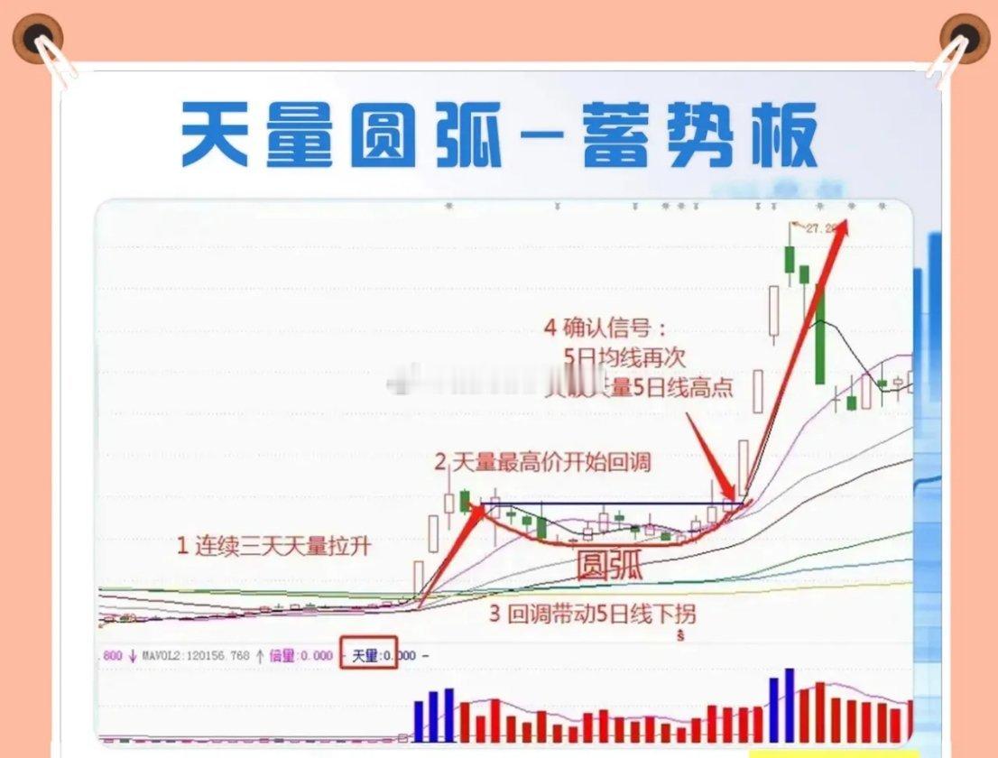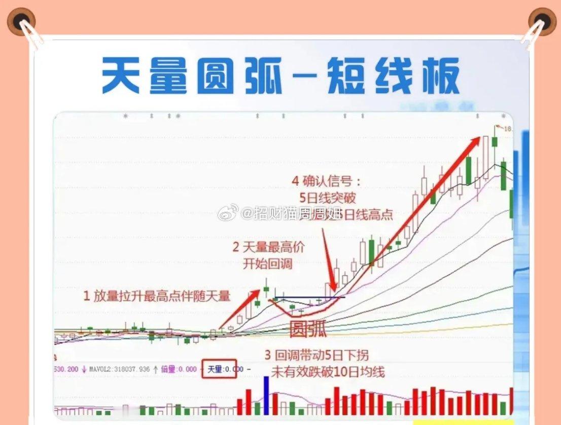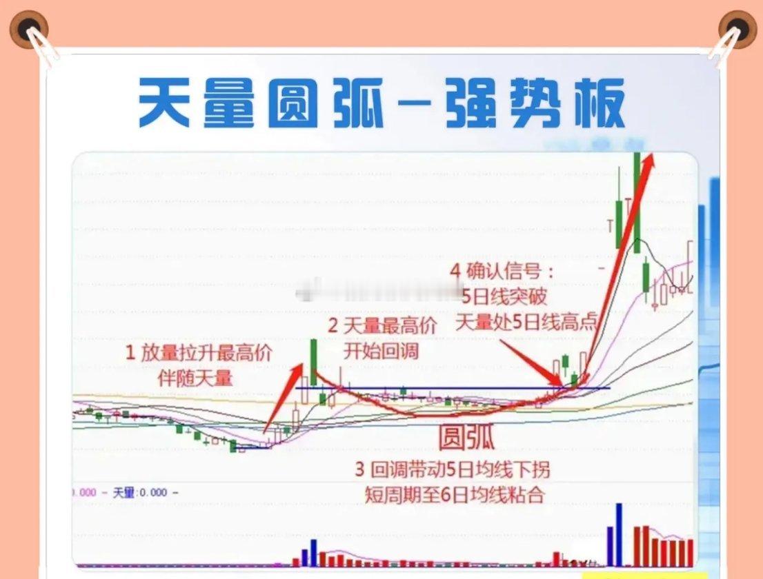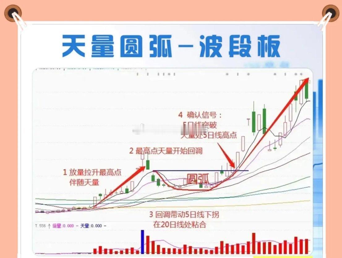 什么是“天量圆弧”形态?天量圆弧形态呢,就是当股价经过第一波拉升时,成交量放出了比拉升前高好几倍的量能,我们称为“天量”,这一般是主力所为,散户是做不到的;随后股价出现回调,走出圆弧底的形态,这其实就是主力洗盘的动作,为了就是清洗不坚定的散户筹码,为第二次的拉升清理障碍,蓄势待发;一旦股价突破前期天量处5日线的高点,就会再次启动拉升。“天量圆弧”形态的条件细节点:1.先经过一波放量拉升,成交量至少放出一根以上的天量;2.天量蕞高价开始出现回落调整,5日线拐头向下,走出圆弧底形态;3.回调过程中成交量一直缩量,说明主力洗盘;4.当5日线放量突破前期天量的5日线高点时,模型成立,将再次开启主升浪拉升。以上就是“天量圆弧”形态需要注意的条件细节,为了大家更好的理解,我整理了相关的图文案例,以及详细的说明,分享在下方,可以收藏起来慢慢研究。