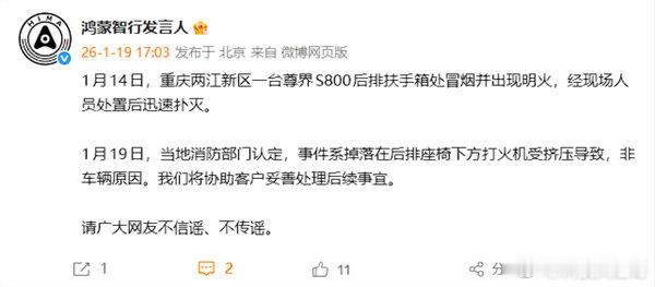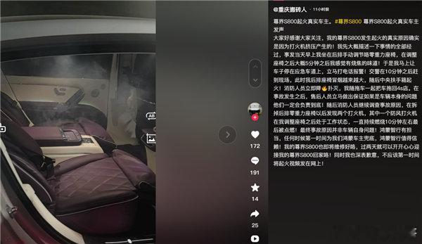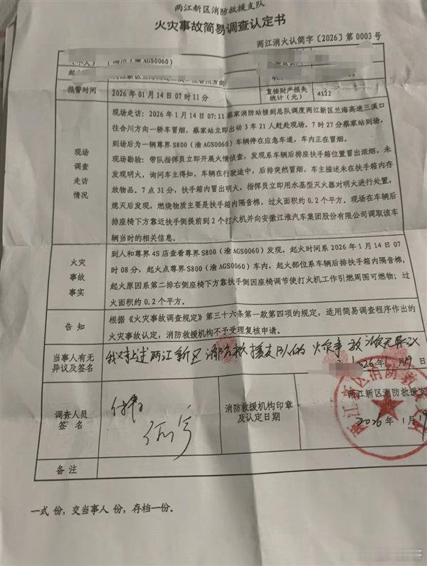 这起尊界S800起火事件总算真相大白了,简单说就是一场由打火机引发的意外,而不是车子本身的问题。具体经过是这样的:1月14日早上,车主在重庆调整后排的零重力座椅,大约5分钟后闻到了焦味。他马上靠边停车报警,但之后烟雾变大,扶手箱还是起火了,幸好被及时扑灭。消防部门调查后发现,罪魁祸首是掉在座椅下的一个防风打火机——调整座椅时它被挤压启动,默默烧了大概10分钟,最终点燃了旁边的隔音棉。过火面积大约0.2平方米,直接损失4122元。鸿蒙智行官方在1月19日回应,确认了消防的鉴定结果,并承诺会协助车主处理后续事宜。这事儿也给所有车主提了个醒:车内真的不要随手放打火机这类易燃物品,尤其是在有复杂调节功能的座椅附近,安全隐患不小。