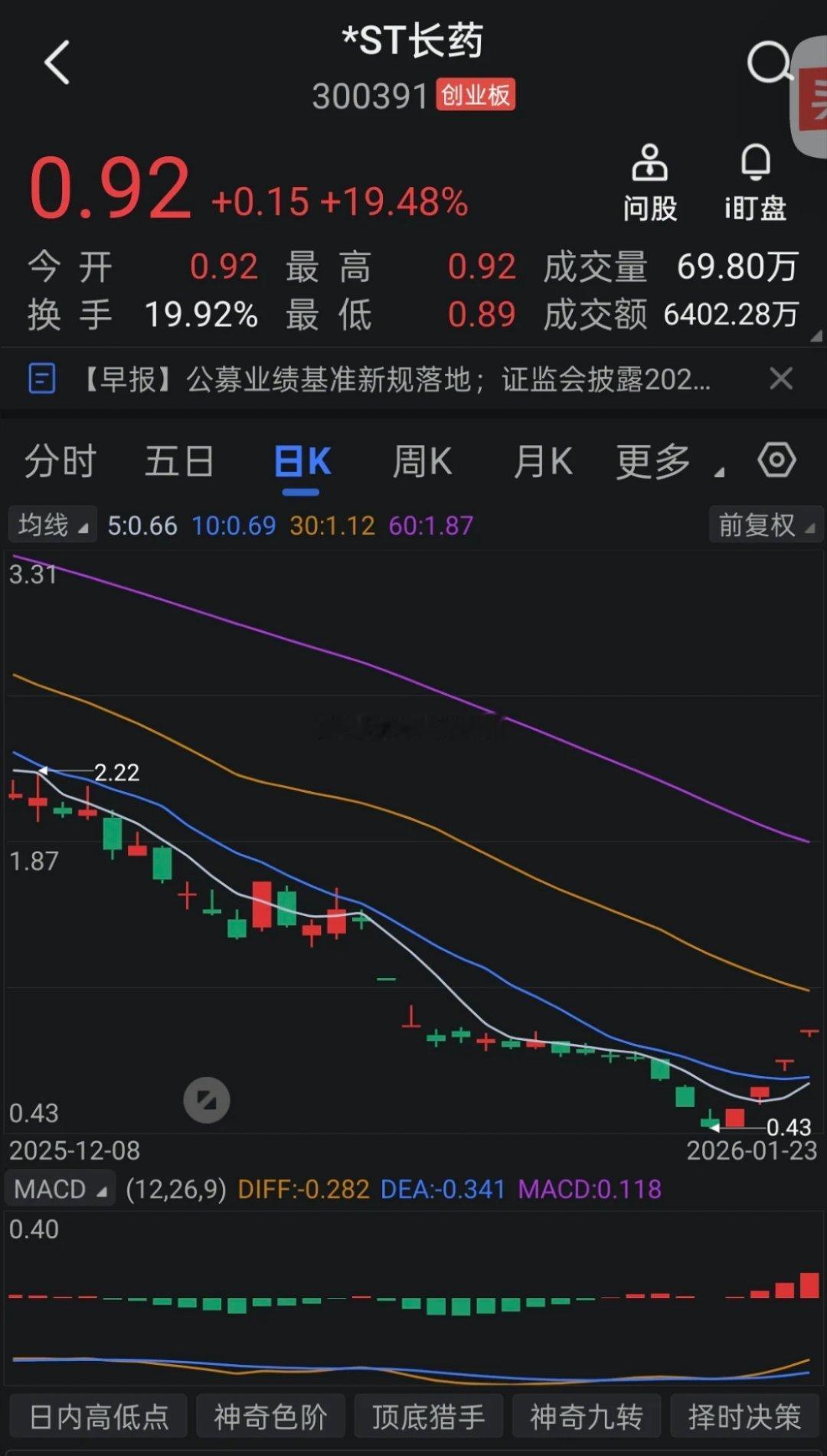 A股。买进ST长药的散户,惊天暴雷。这次又有多少散户,被迫闭关修炼。人家涨停闭关修炼,是利润越来越多,你这修复是直接走火入魔。ST长药公告,将于1月26日起停牌,好家伙我一看4个涨停,全是20厘米的大长腿。我再一看,主力资金都在流出,主力都在跑,市值只剩几个亿。散户怎么有胆量冲进去,不得不佩服,你们的胆量,这下山顶站岗,山顶的风,凉嗖嗖。又一批散户,宣布破产。其实,要有预兆,这家企业已经,连续多次发出风险警示,还是有人,为了赌一把,赌赢了全家幸福,赌输了,从头再来。