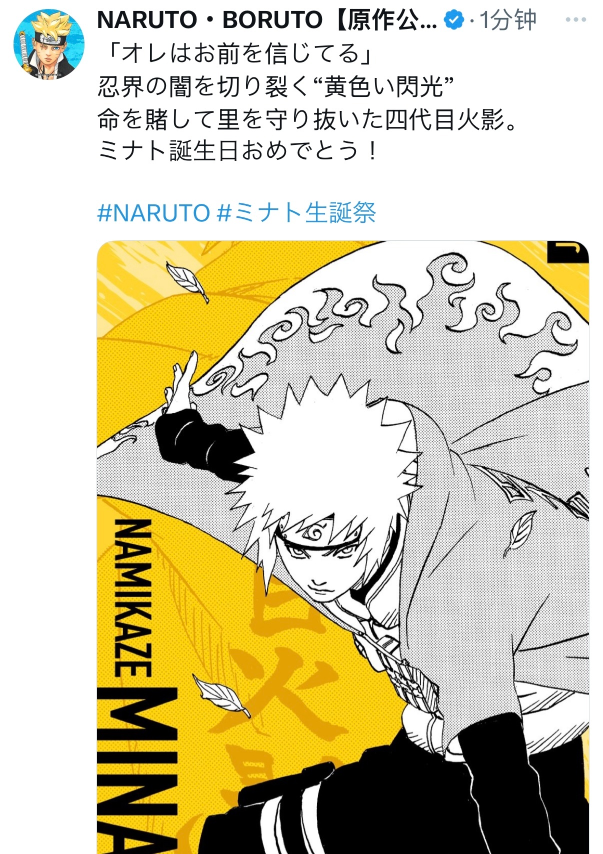 【火影忍者官方最新发布人物生日贺】“我相信你”一道划破忍者世界黑暗的“黄色闪光”冒着生命危险保护了村子的第四代火影。水门生日快乐!火影忍者波风水门