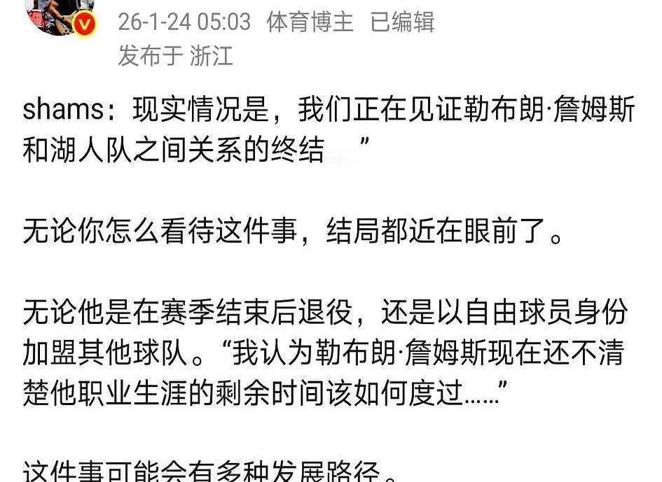 Shams一句话把窗户纸捅破:詹姆斯和湖人,快散了。 合同剩最后半年,湖人提前表态“不续”,摆明要翻篇。老板早想拆伙,22年就想甩,只是老詹手握否决权,动不了。如今到期自然分手,省得撕破脸。 别急着骂资本家冷血。生意就是生意,冠军拿了,门票赚了,收视率保住了,互相谁也不欠谁。湖人想省钱练新人,老詹想最后再冲一把,道不同不相为谋,好聚好散比硬凑一起体面。 至于“湖人变二队”?醒醒,快船再风光也租球馆,紫金外套还在球馆上空挂着。招牌褪色是战绩烂,不是谁走谁留。真想回榜首,靠选对人,不靠赖着谁。 老詹若留下,降薪是必答题;若出走,也别说背叛。都是成年人,各选前程,就这么简单。