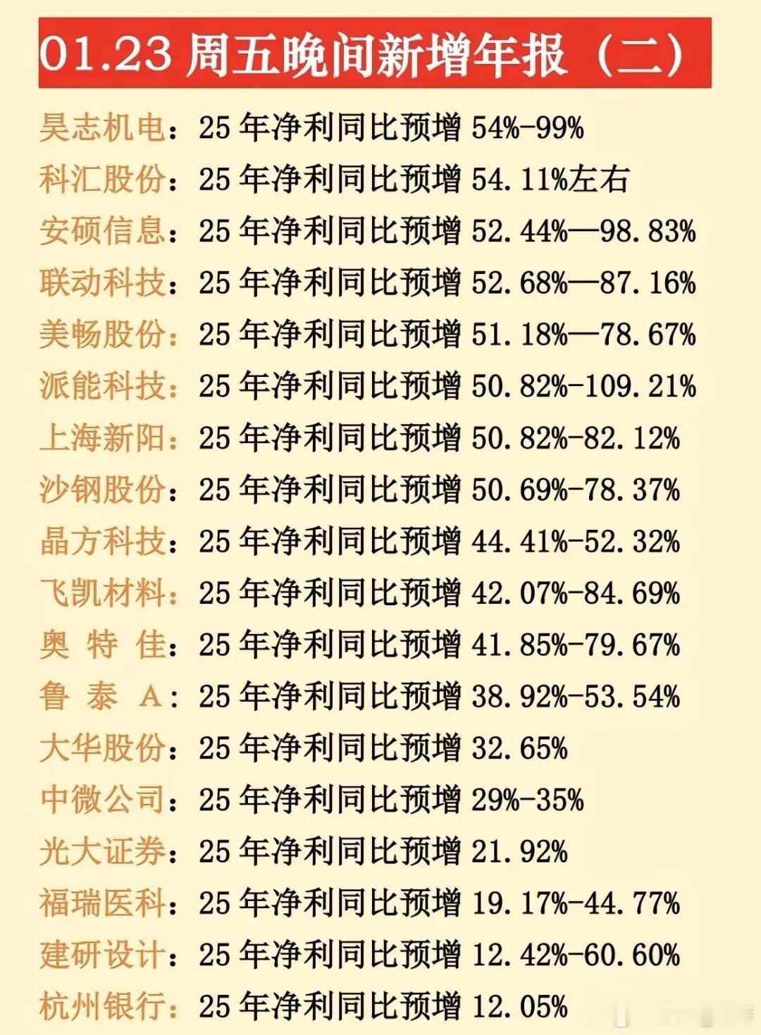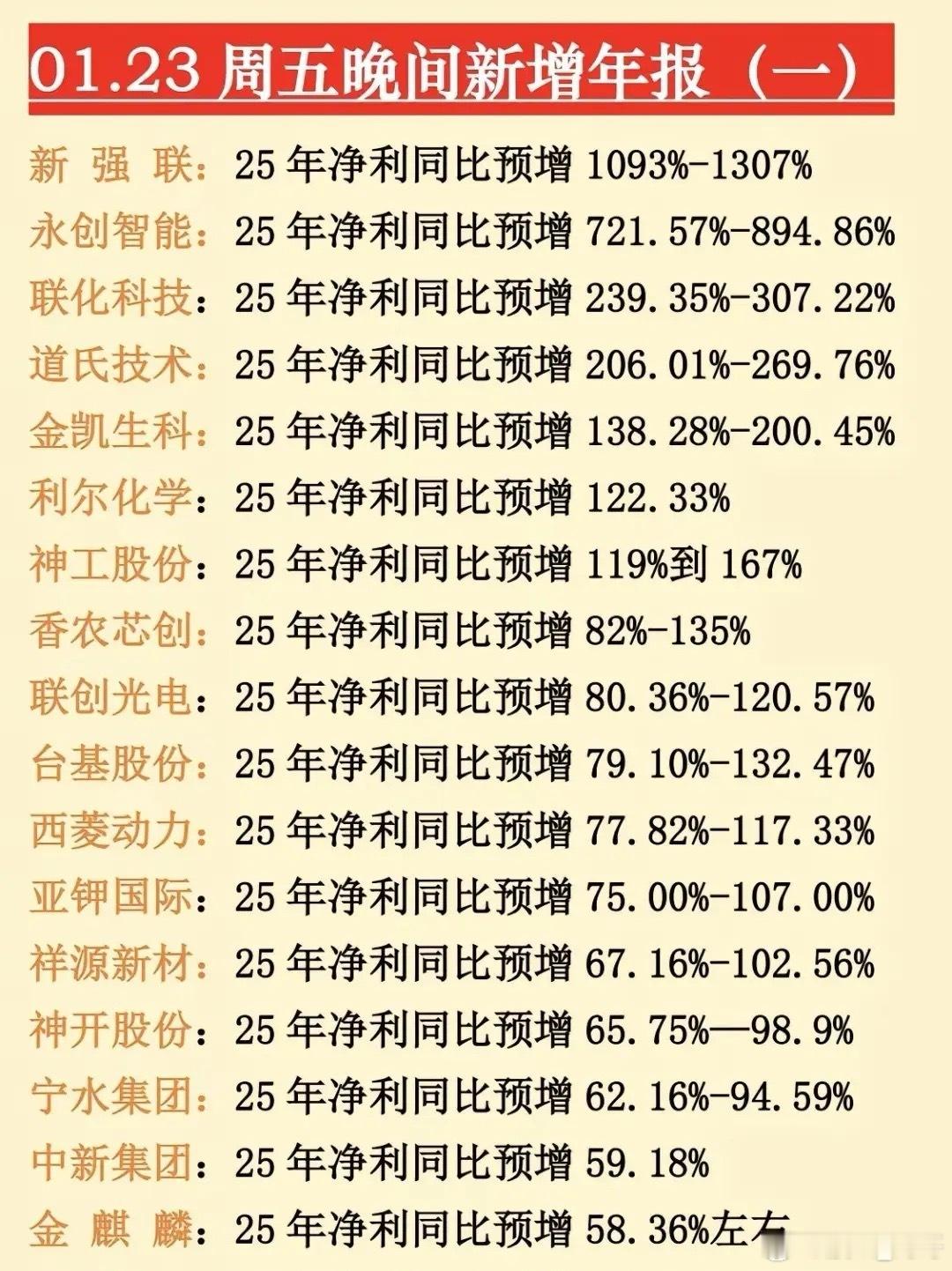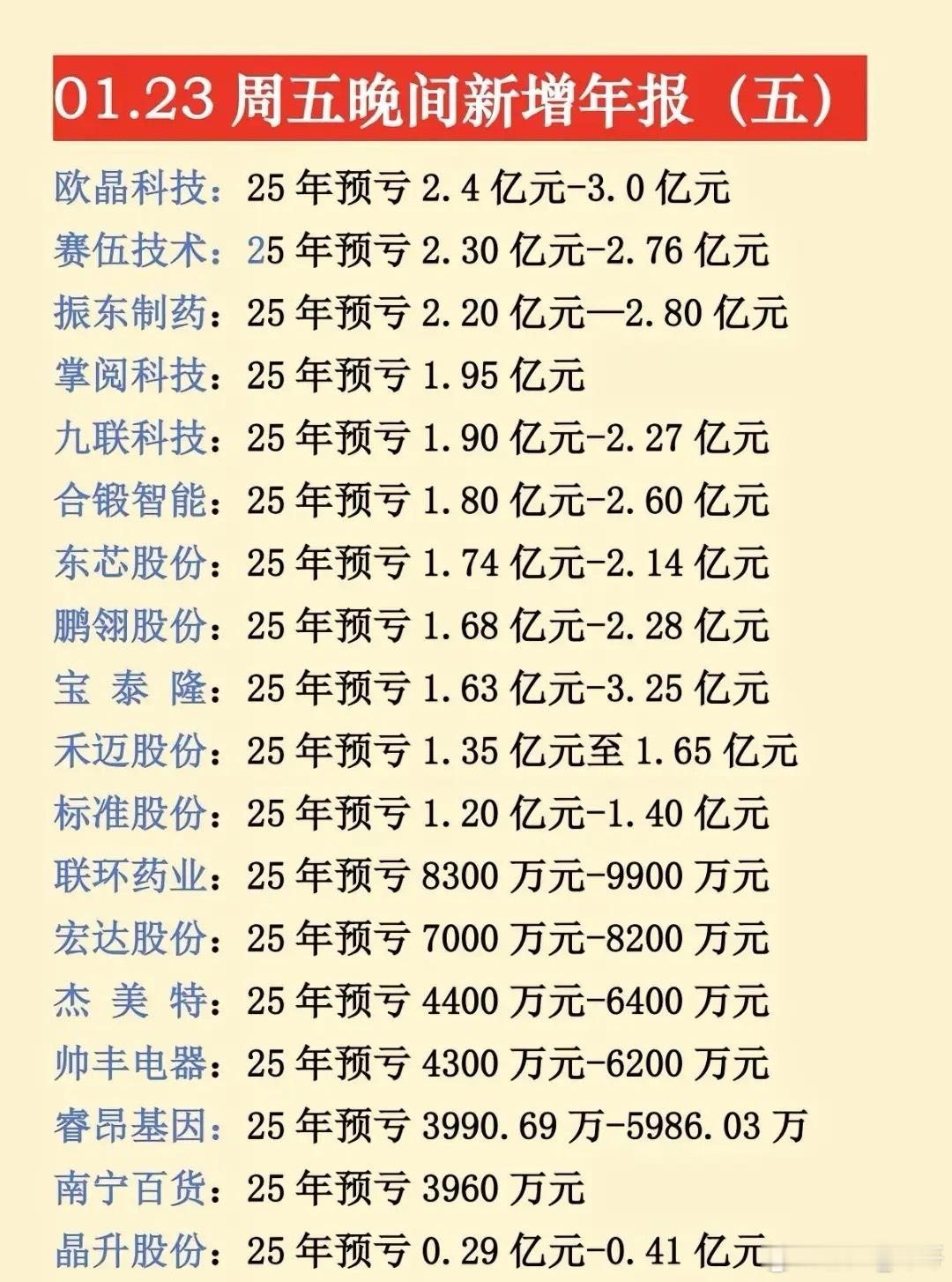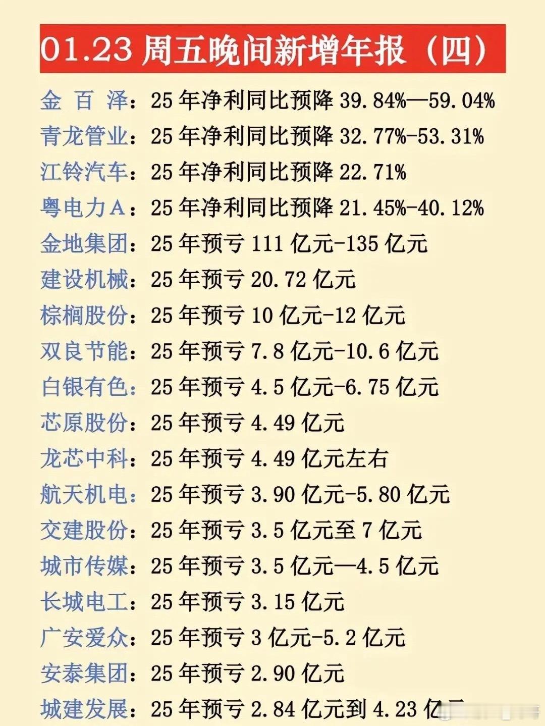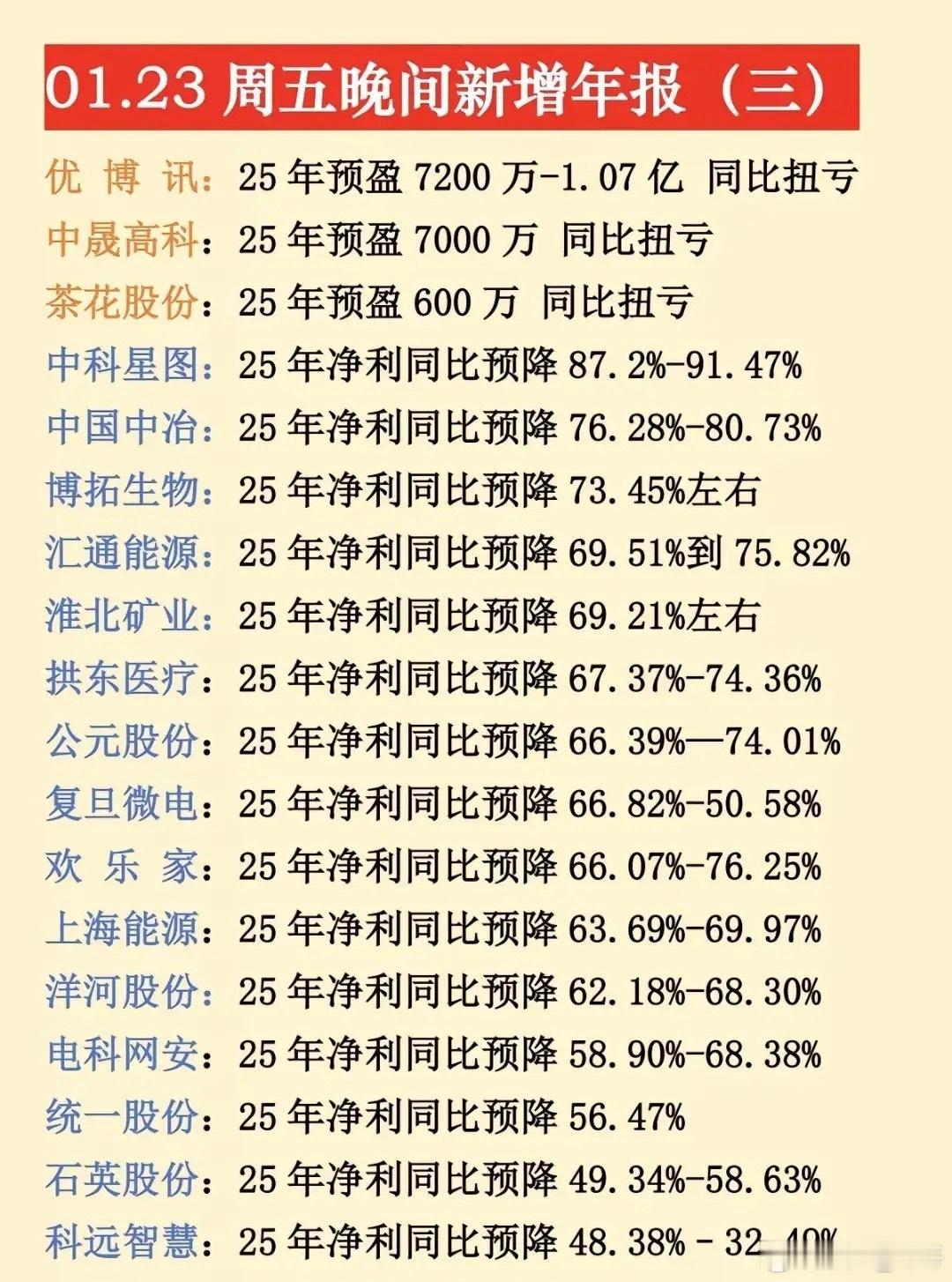 最新年报预告出炉,1月23日晚间更新的数据来了!不少大牛股、央国企龙头年报堪忧,同比大幅预减预亏,注意业绩风险!⚠️预降暴击:中科星图、中国中冶等超20家公司净利润大幅下滑,最高预降超91%,洋河股份等消费龙头也未能幸免。央国企控股预亏预减公司有电科网安、中国中冶、粤电力、航天机电、信科移动、白银有色等等。电科网安作为网络安全领域的国家队,2025年净利润同比预降58.90%-68.38%,是1月23日晚间披露的预降个股之一。航天机电公司背靠航天科技集团,是国内光伏行业较早布局的企业之一。2025年预计亏损3.90亿元-5.80亿元…~