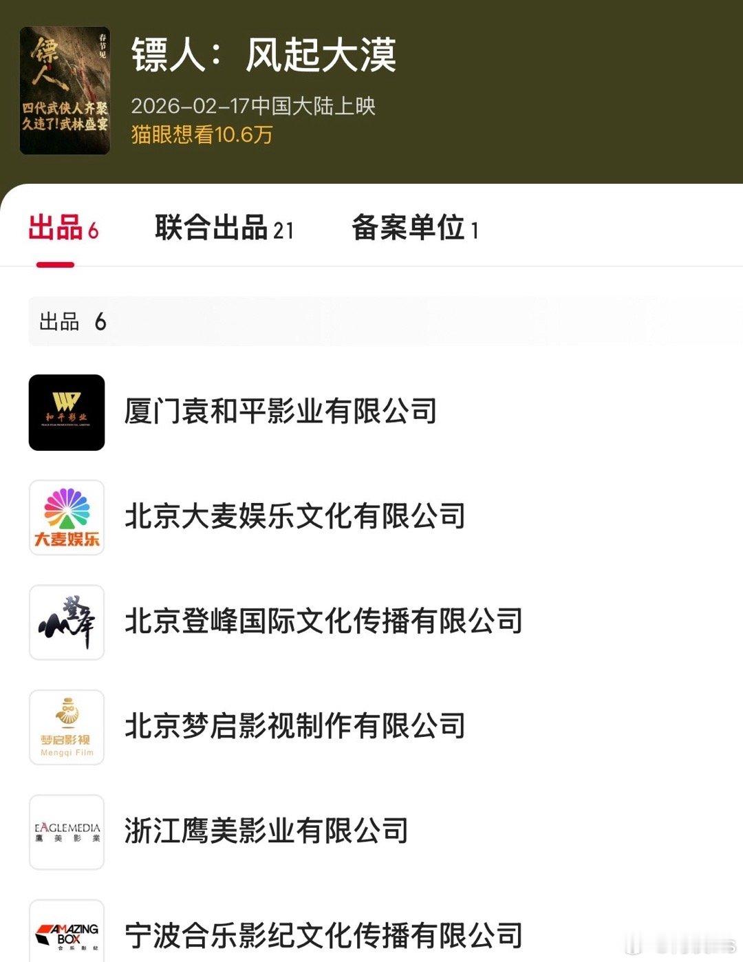 电影《镖人》6个出品+21个联合出品出品:袁和平影业,大麦、登峰(吴京)、梦启等联合出品:长影、江西电影集团、方特、安瑞(张译)、万达、华人、微博等