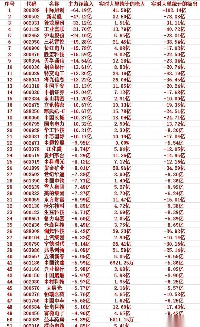 1月23号,收盘前最后30分钟。 一笔64亿的巨单,毫无征兆地从中际旭创的盘口砸出,卖出键像是被焊死了,数字翻滚着往下掉。 这不是点射,是地毯式轰炸。 紧接着,新易盛,78亿。工业富联,40亿。锋龙股份,31亿。一串串冷冰冰的数字,像瀑布一样从屏幕上刷下来,根本不计成本,唯一的指令就是“卖出”。 过去最硬的科技赛道,光模块、算力、芯片,瞬间成了重灾区。那些平时被捧上天的龙头股,此刻像是被掐住了脖子,只有流出的红字,没有承接的绿盘。 有人想去抄底,刚伸出手,就看到一堵更厚的墙压了过来。紫金矿业、澜起科技,盘中明明涌进来20多亿的买单,试图稳住阵脚。但对面直接用两三倍的抛盘,把它瞬间吞掉,连个水花都看不见。 这不是恐慌,这更像一场计划周密的撤退。 就连那些你以为最稳的“压舱石”——招商银行、中国平安、长江电力,也开始同步失血。平时纹丝不动的大家伙,那点买盘在巨大的卖压面前,就像用纸去挡洪水。 整个盘面,找不到一个安全的角落。资金不是从一个板块流向另一个板块,而是直接抽走了。 这就好像宴会开到一半,主桌上的人突然一声不吭,集体起身离席,只留下一屋子目瞪口呆的散户。 所以这到底是风声走漏了,还是一场心照不宣的集体收割?