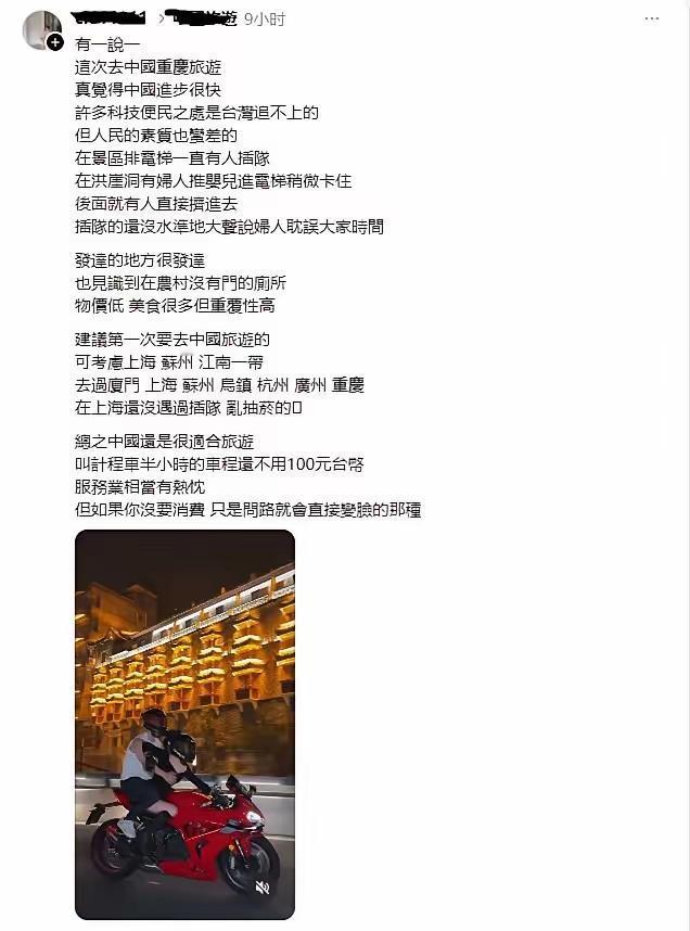 这个台湾人去了大陆这么多城市,仍然未能建立对大陆的正确认知,可见他对大陆的偏见根深蒂固。 这位台湾朋友首先承认大陆进步很快,许多科技便民之处台湾追不上。但是人民素质差。 景区坐电梯一直有人插队,有推婴儿车的妇人坐电梯卡住还被人责备说耽误大家时间,见到了农村没有门的厕所,美食很多但重复性高,问路的时候有消费就会很热情,没消费就会变脸。整个发文中,用词全部是“中国”如何如何,从未使用“大陆”这一用词。 整体来看,发文处处透着“审视者”的傲慢,他口口声声说的“中国”,充分暴露他的心态,在他的认知里,大陆只是一个“外国”般的存在,而非血脉相连的故土。这种先入为主的疏离感,让他的观察从一开始就戴上了有色眼镜。 不可否认,大陆发展存在不均衡,城乡之间、区域之间仍有差距,但这绝不是用来否定整体进步的理由。他看到景区有人插队、服务态度不够热情,便以偏概全得出“人民素质差”的结论,却忽略了大陆14亿人口的复杂与多元。就像不能用个别城市的拥堵否定整个交通体系的高效,更不能用偶发的不文明行为否定整体国民素养的提升。 大陆的魅力,正在于它的丰富层次。既有重庆洪崖洞的璀璨灯火,也有乡村质朴的老屋;既有上海的摩登繁华,也有苏杭的婉约雅致。这种多样性不是“缺点”,而是真实的生命力。真正的包容,是带着理解去看待差异,而非用单一标准去审判。 中国太大,什么样的地方都有,什么样的人都有,上海外滩无法代表中国,偏僻的农村无法代表中国,看到中国一角,就说中国如何如何,都是极其幼稚的表现。