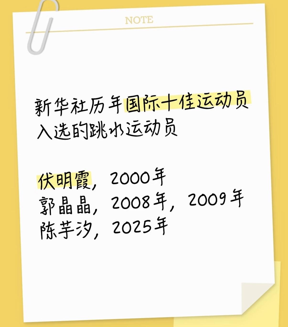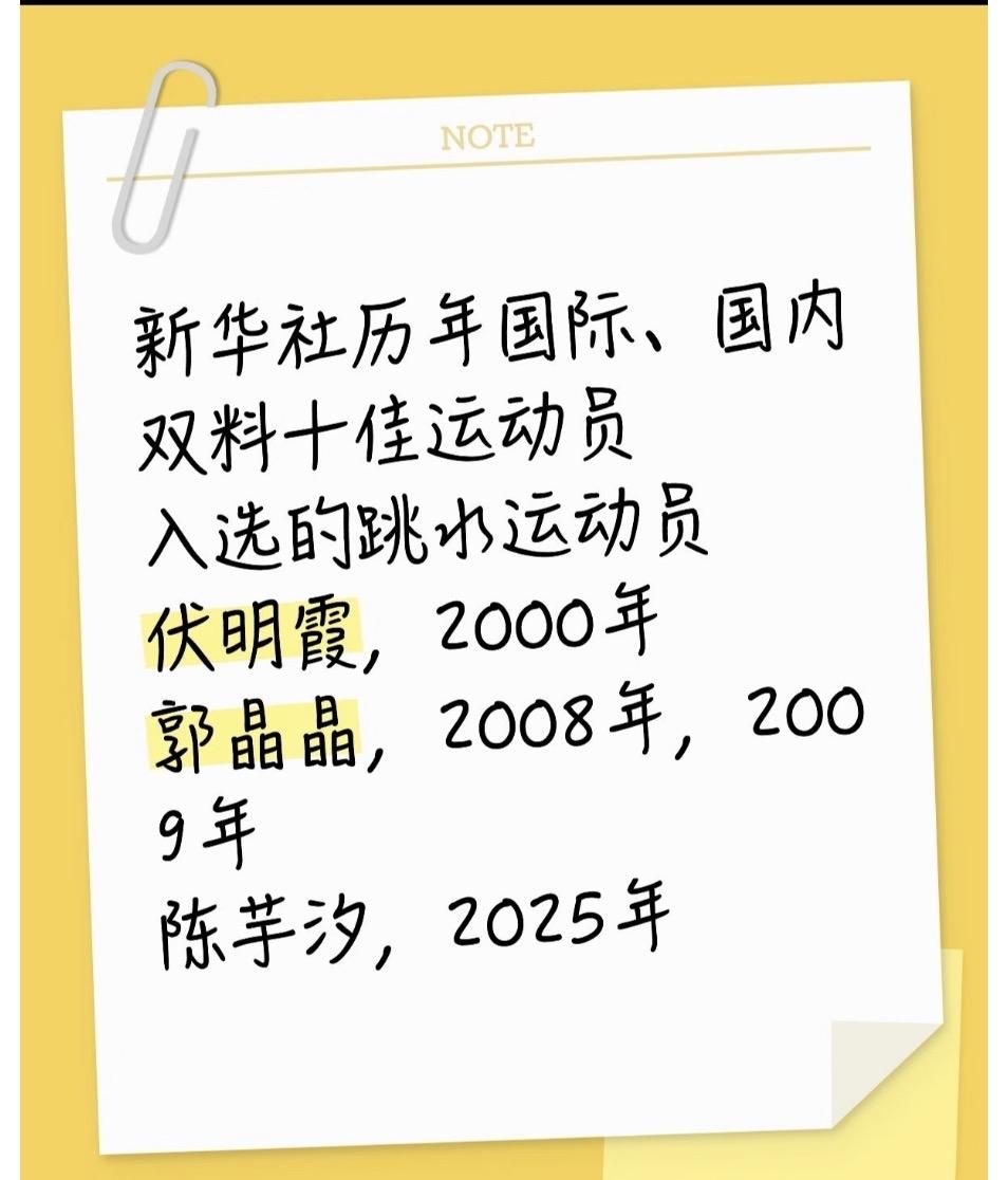 上篇: 《她打破了郭晶晶后的16年魔咒, 连奥运"五金王"陈若琳都未曾做到》 不查不知道,一查吓一跳! 陈芋汐竟填平了 中国跳水十六年的"荣誉断档"。 更惊人的是, 连中国🇨🇳伟大的"跳水女皇" 五枚奥运金牌获得者陈若琳, 都从未入选过这项"国际十佳", 这足以凸显了此项荣誉的稀缺性 与至高难度。 而陈芋汐的入选, 无疑是她个人巅峰实力最有力证明。 上一次有中国跳水运动员的名字闪耀 在新华社"国际十佳运动员"的榜单上,还是2009年的郭晶晶。 此后长达十六年, 任凭"梦之队"如何摘金夺银, 这扇代表年度全球体育顶级影响力的门,再未为中国跳水运动员开启。 直到2025年, 一个名字终结了这段漫长的空白 一一陈芋汐。 她的入选, 不是一个简单的"喜讯", 而是一次断档历史的强势终结。 这背后绝不仅仅是又一枚金牌, 而是一整年无可争议的、 具有全球影响力的统治级表现。 她究竟在2025年做了什么? 下篇为您揭晓她横扫世界的成绩单。