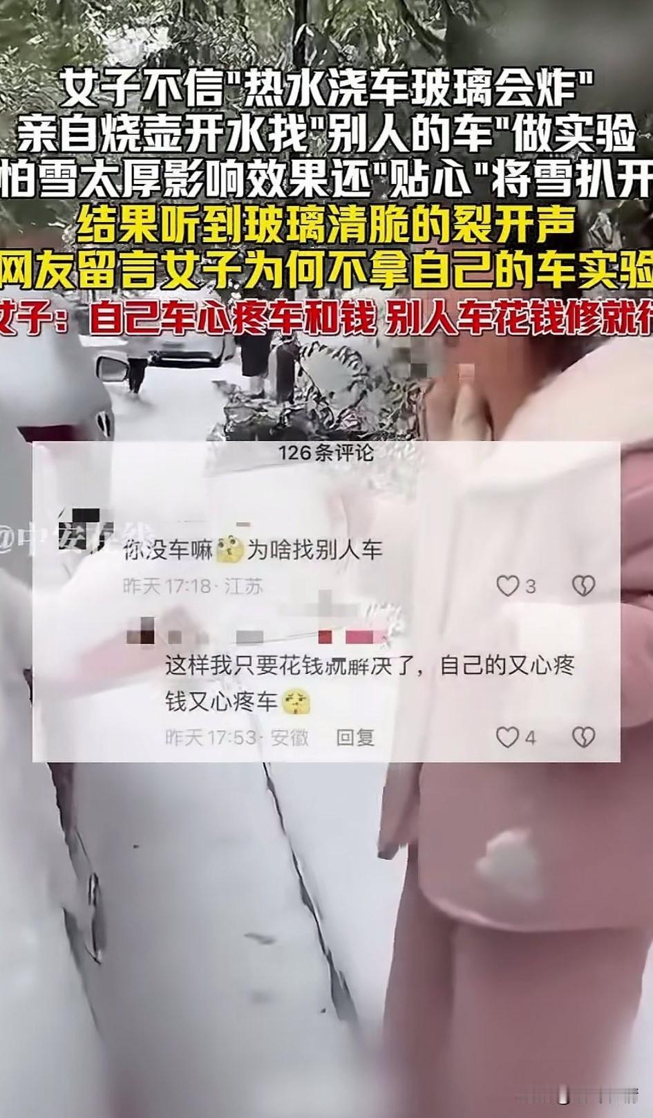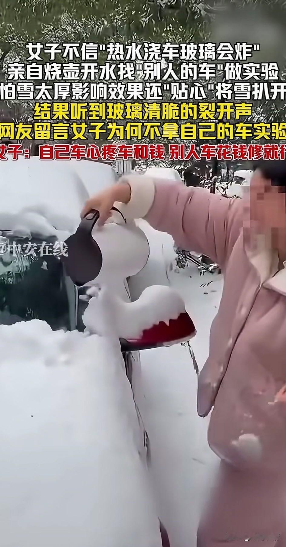 女子不信热水浇车玻璃会炸,亲自用热水壶烧开水,用别人的车做实验!还有这样的人? 最让人气愤的是,她居然还录了视频,将自己的行为拍了下来,见过想出名的,没见过想网暴自己的! 这女子就是这样的人,之前她拿着开,说她在抖音上看到,用热水浇车窗玻璃会炸,她不信! 今天她就给大家展示一下,关键这还不是她的车,只见她随机找了一辆车,直接将开水壶里的水倒倒上了车窗玻璃! 因为有厚厚的积雪,她怕效果不好,还贴心的将车窗玻璃上的雪给弄干净,然后开始直接倒下… 很快便听到了玻璃炸裂的声音, 她还直接的开心笑了,还说原来真的如此!有网友留言你为什么不找自己的车做实验? 谁知女子的回复更加逆天,用自己的车,心疼车和钱,别人车花钱修就行! 还有这种人! 还真是林子大了什么鸟都有,这女子真是太让人生气了!没想到视频在网络火了! 人真是红了,不过是黑红,想必她所在的小区都知道了,损坏车的车主估计要上门找她了,要是直接追究责任,估计还得拘留,故意破坏他人财产! 人家要是不愿意和解,那就不是修车的问题了,大家对于这样的女子怎么看? 社会新闻 自私自利的人就是坏人吗? 烧玻璃 汽车玻璃爆炸