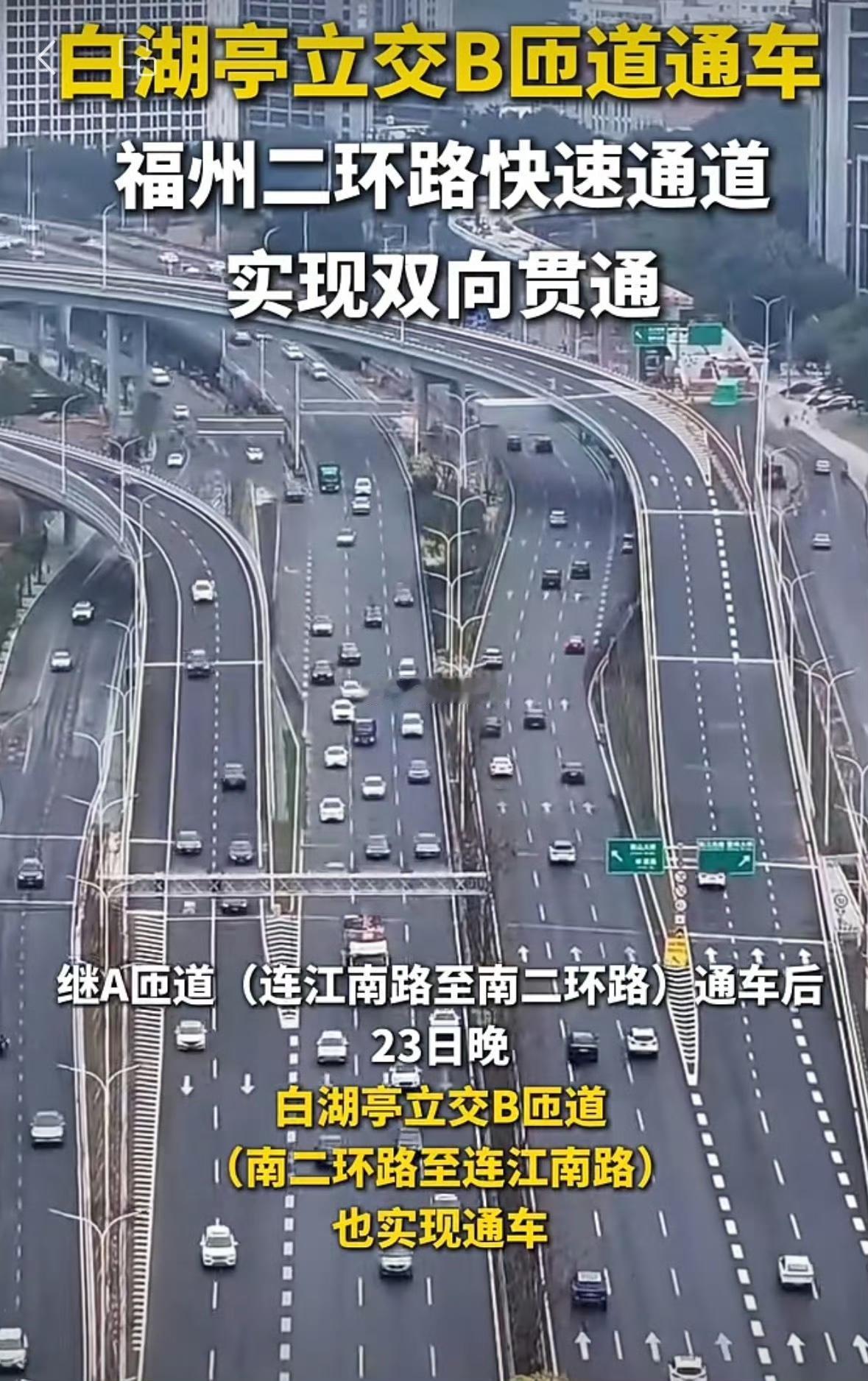 【二环快速通道双向贯通】 已经通车的白湖亭立交B匝道通车!福州二环路快速通道,实现双向贯通,大家通行便利许多! via@最爱福州 虎纠人讲福州